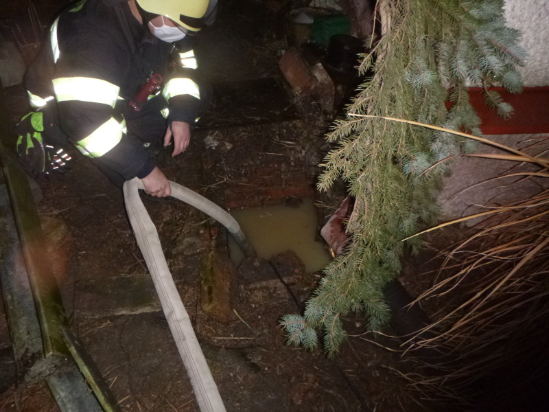 Čerpání vody ze sklepa rodinného domu v části Dolní Vlčkovice. (JSDH Choustníkovo Hradiště)