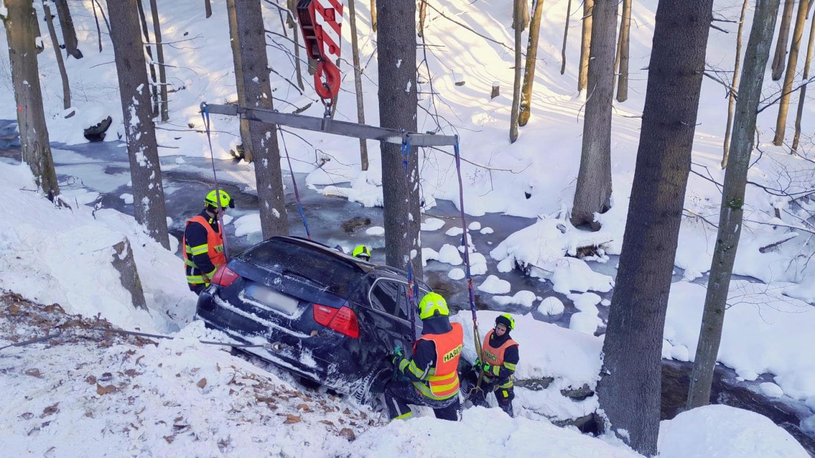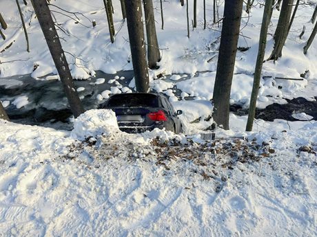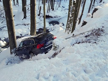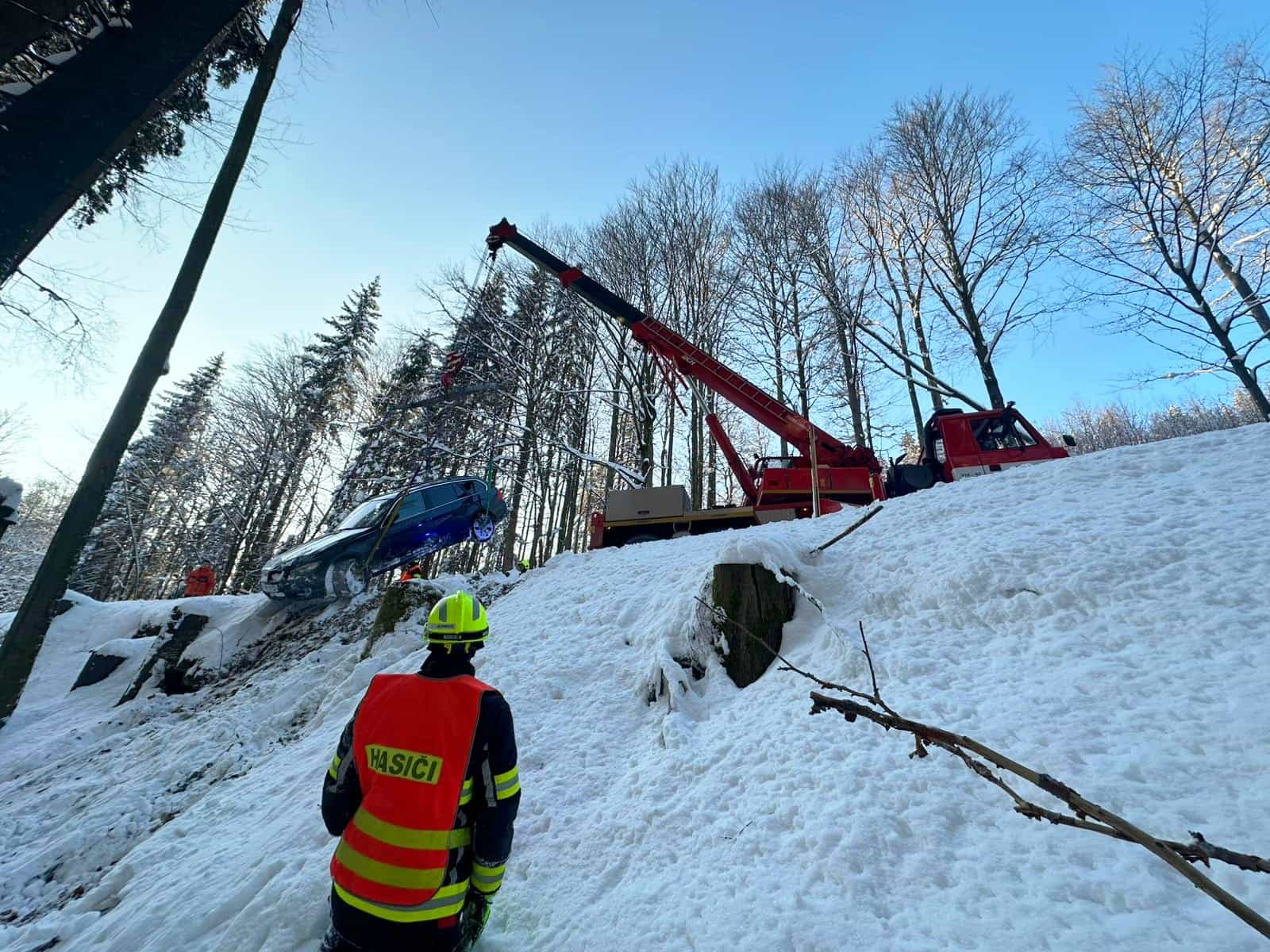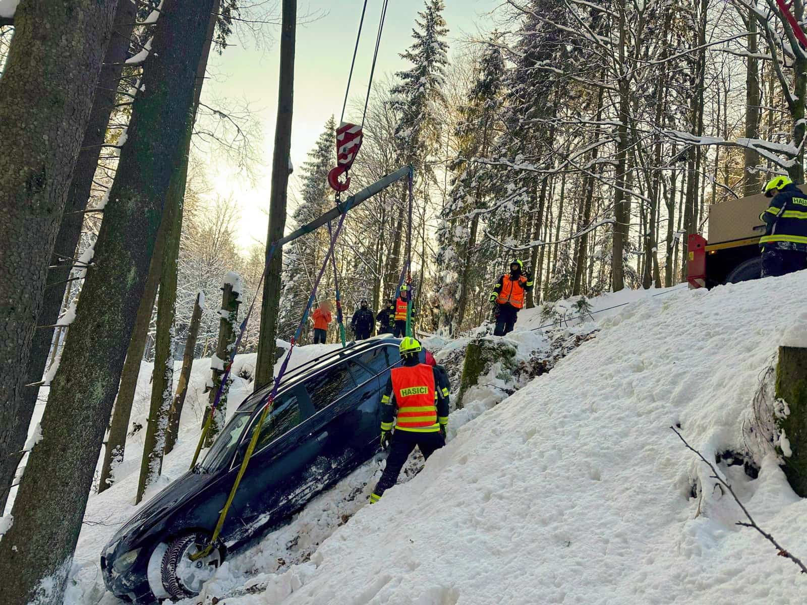 Zimní podmínky komplikovaly ve čtvrtek odpoledne dopravu, když osobní automobil sjel ze silnice do strmé stráně. Hasiči zabránili jeho dalšímu pádu a vyproštění trvalo zhruba tři čtvrtě hodiny.