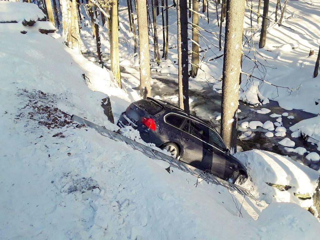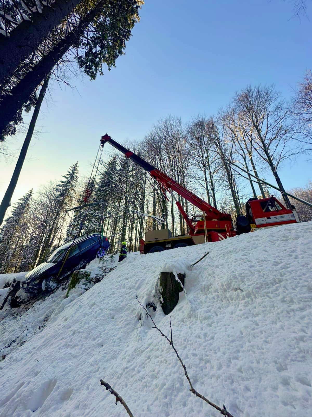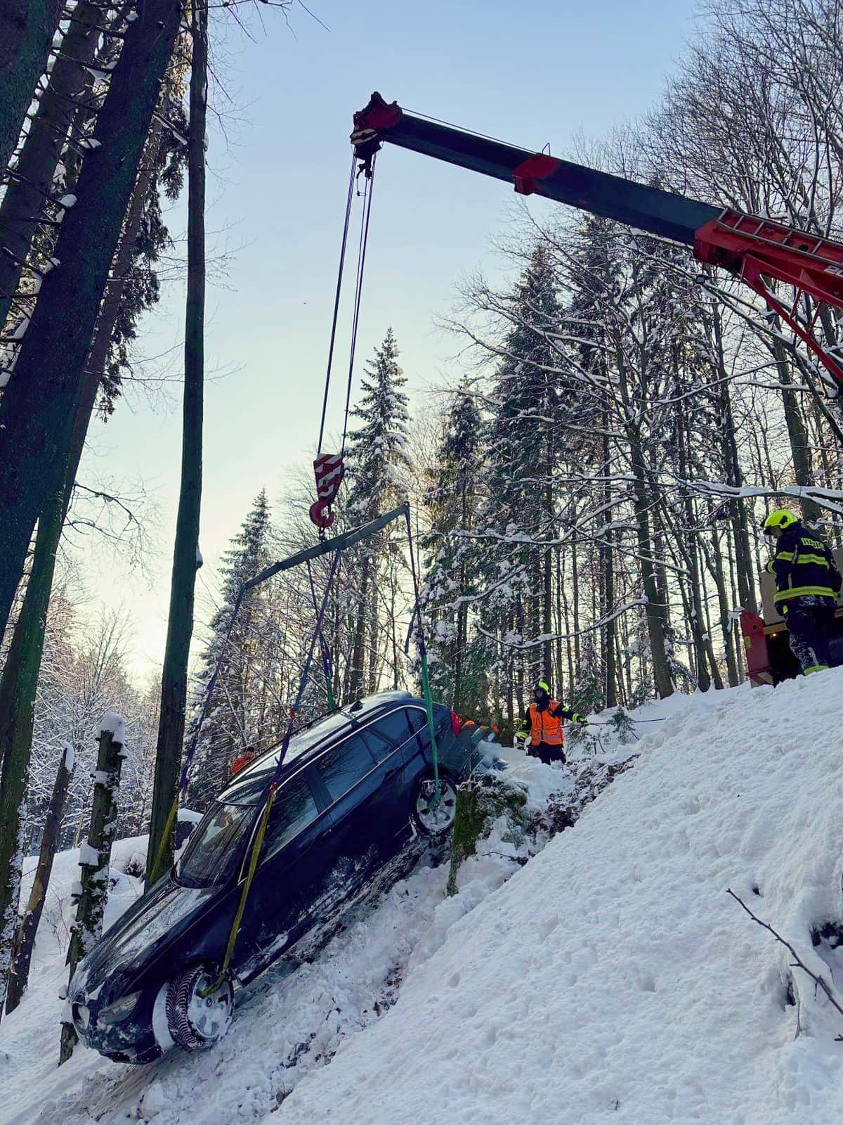 Zimní podmínky komplikovaly ve čtvrtek odpoledne dopravu, když osobní automobil sjel ze silnice do strmé stráně. Hasiči zabránili jeho dalšímu pádu a vyproštění trvalo zhruba tři čtvrtě hodiny.