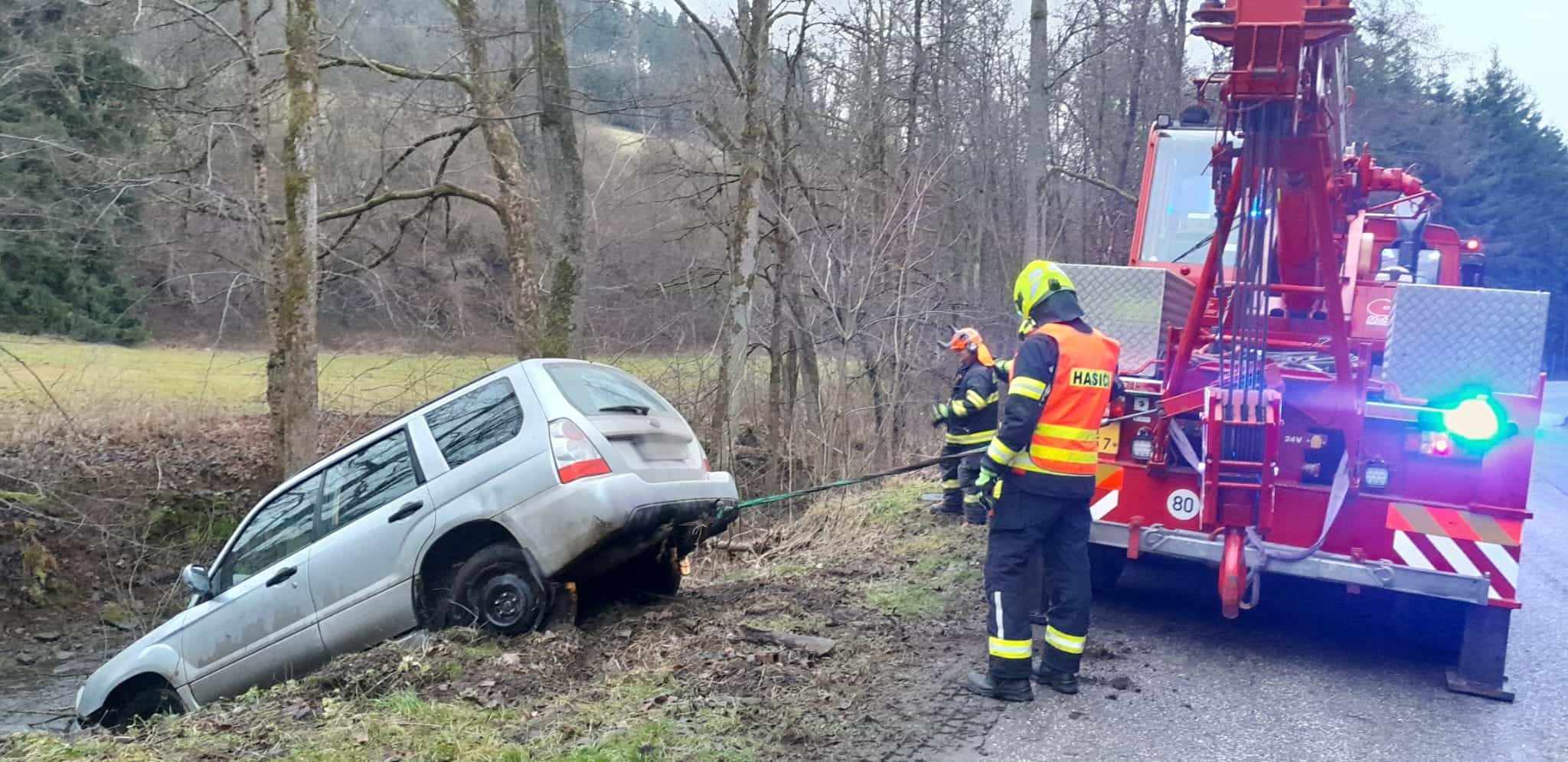 Havarovaný osobní automobil skončil v potoce u silnice třetí třídy. Profesionální hasiči jej v odpoledních hodinách bezpečně vyprostili a zajistili místo proti úniku provozních kapalin. Událost se obešla bez zranění.