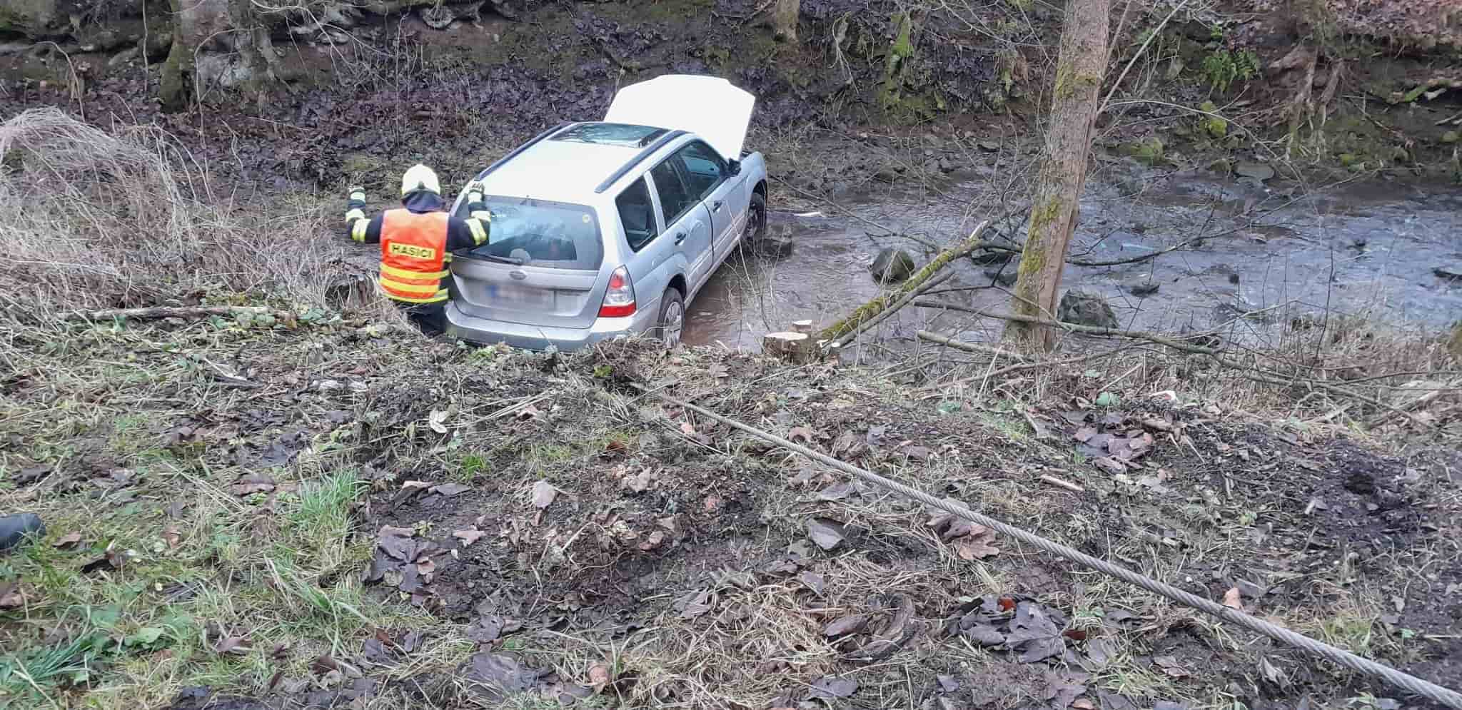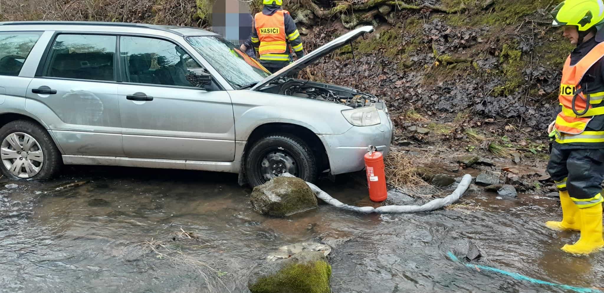 Auto skončilo v potoce. Hasiči zasahovali u nehody bez zranění