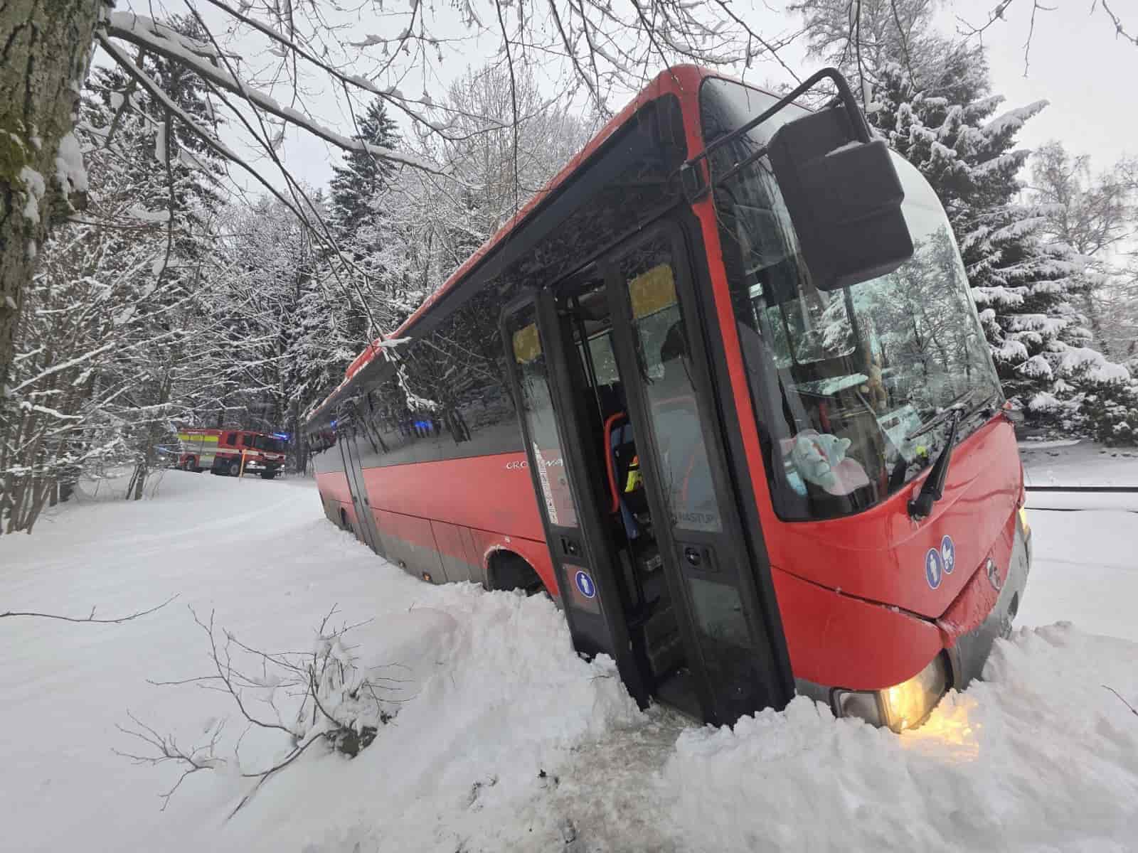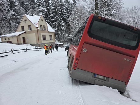 Autobus po nehodě skončil ve sněhu, hasiči nasadili pásový obojživelník