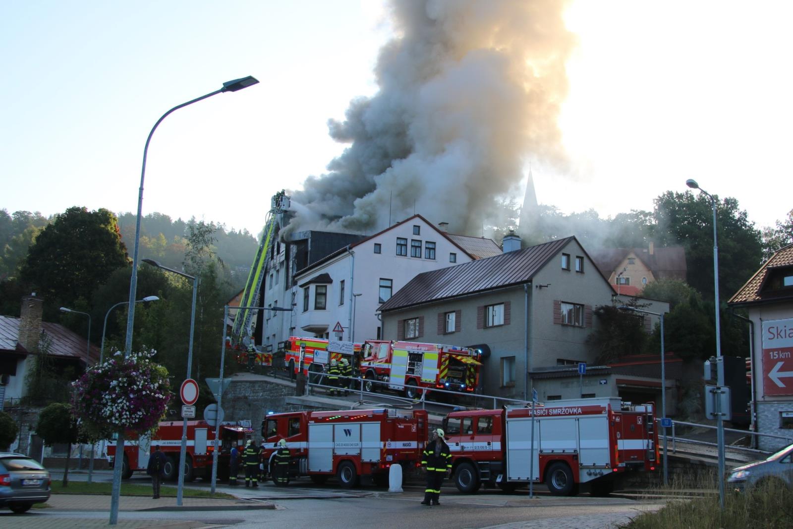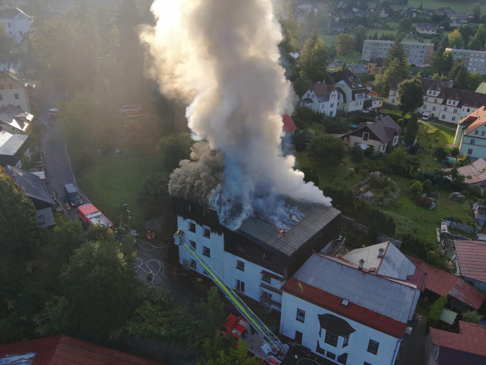 Jednotky z 3. stupně požárního poplachu vyjely dnes 15. září 2023 před sedmou hodinou ranní do Tanvaldu k požáru budovy bývalého penzionu v rekonstrukci.