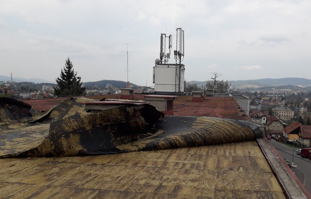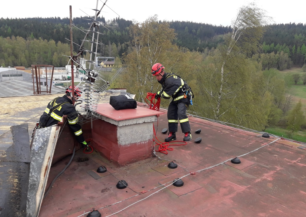 Foto: Shrnutá střecha bytového domu v Jablonci nad Nisou, ulice Vlaštovčí, HZS LK, stanice Jablonec nad Nisou.
