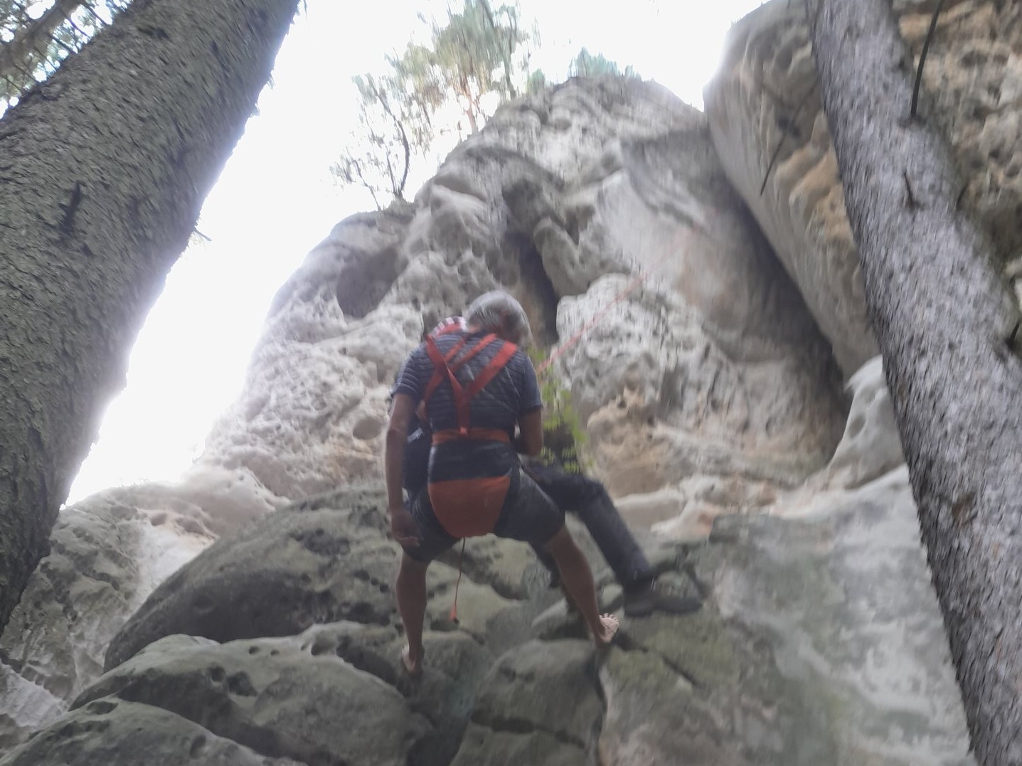 Hasič – lezec zachraňovaného muže zajistil do záchranného trojúhelníku a bezpečně s ním slanil z desetimetrové výšky dolů na zem