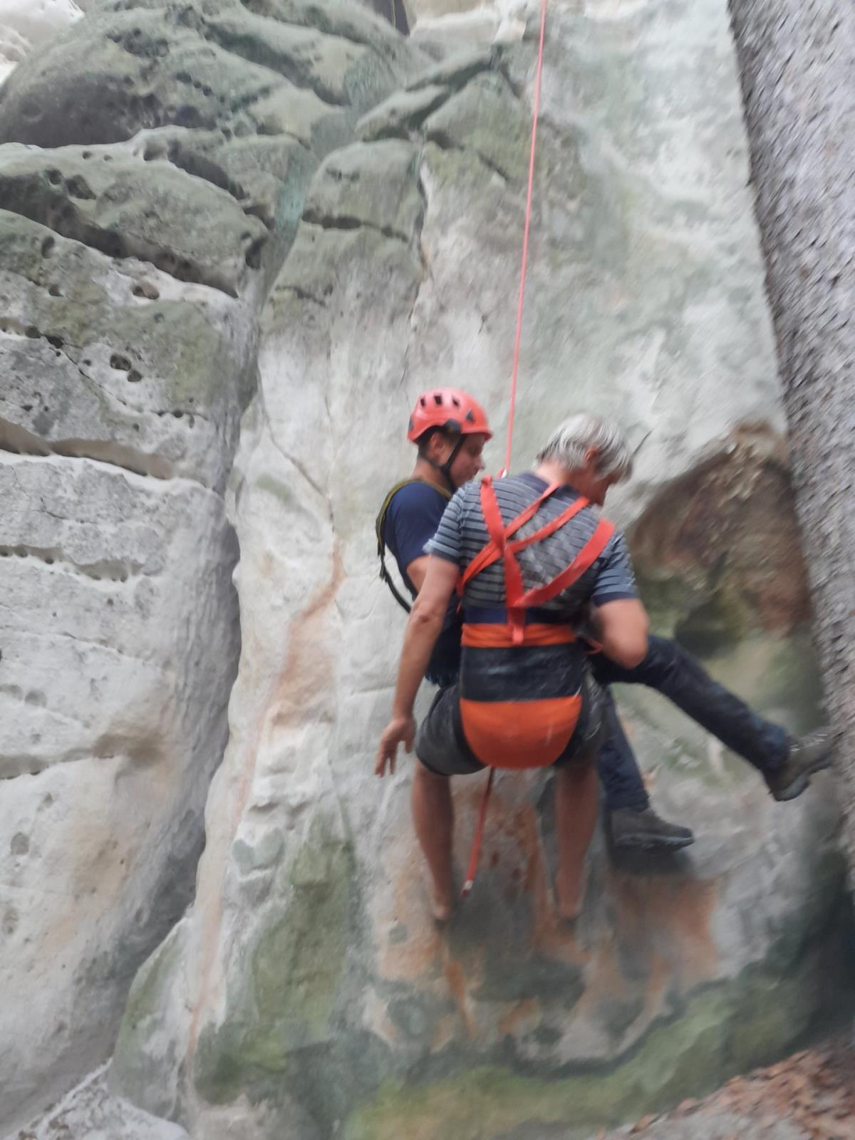 Po příjezdu na místo události hasiči průzkumem zjistili, že muž a pes se nachází na skále v přibližně 10metrové výšce. Jeden ze zasahujících hasičů – lezců z liberecké stanice seshora slanil přibližně 10 metrů za zachraňovaným zvířetem a mužem. Nejprve ve spolupráci s dobrovolnými hasiči zachránili psa.