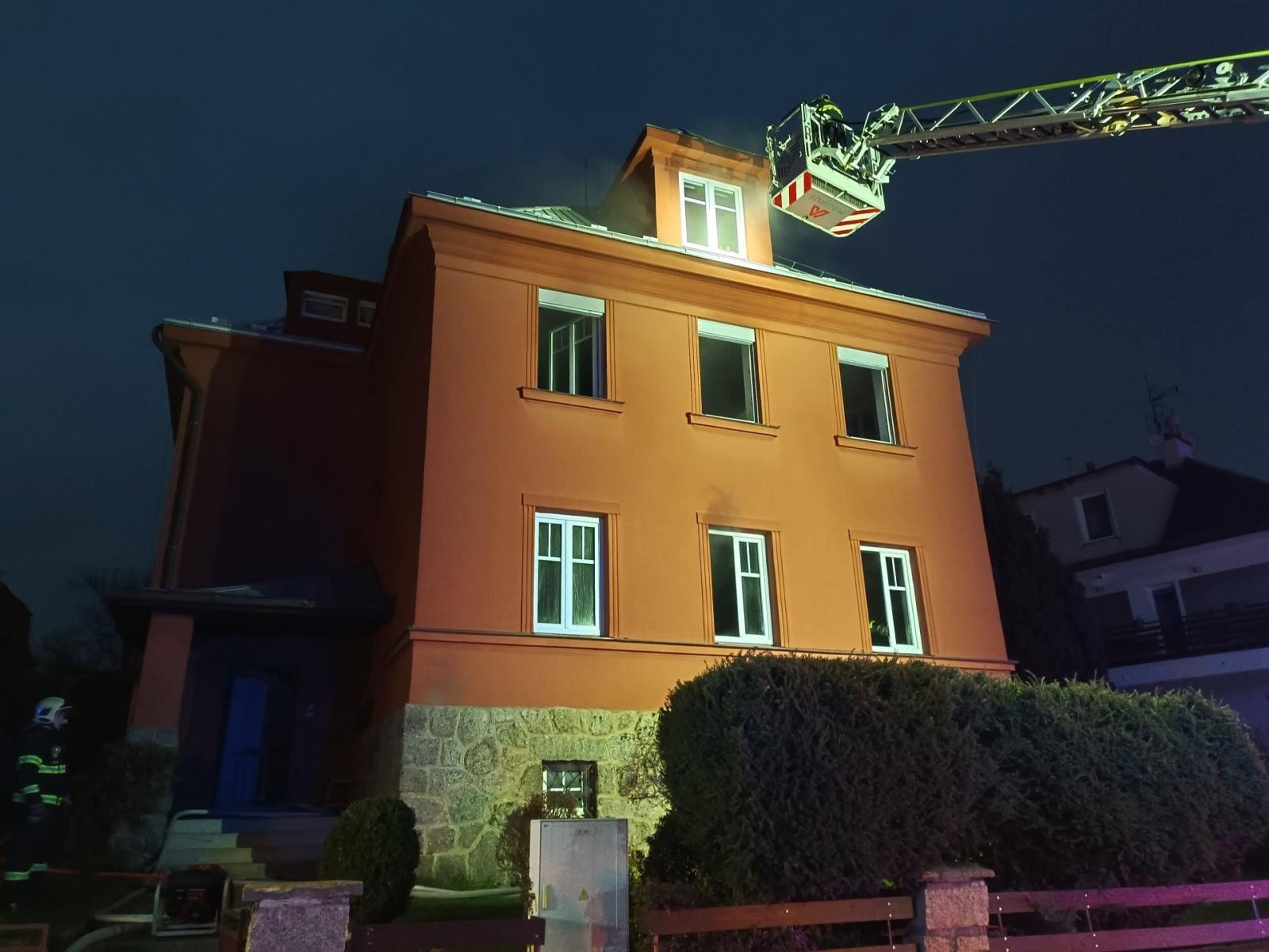 Po příjezdu na místo události profesionální hasiči ustavili výškovou techniku – automobilový žebřík AZ 40 z centrální hasičské stanice Liberec, pomocí kterého z objektu zachránili tři zraněné osoby a předali je do péče zdravotníků. Další jedna zraněná osoba byla v péči Zdravotnické záchranné služby Libereckého kraje již při příjezdu jednotek požární ochrany na místo.