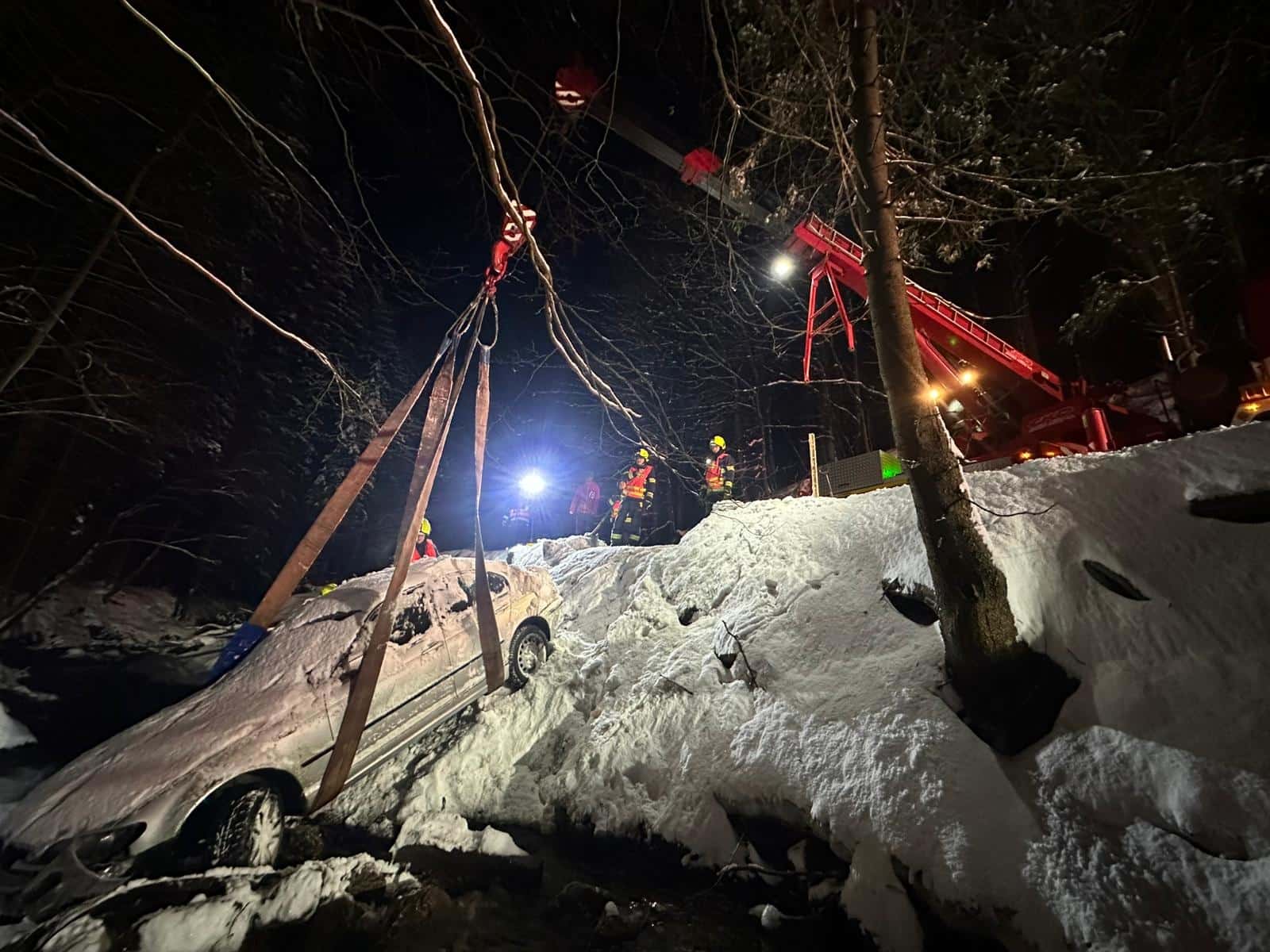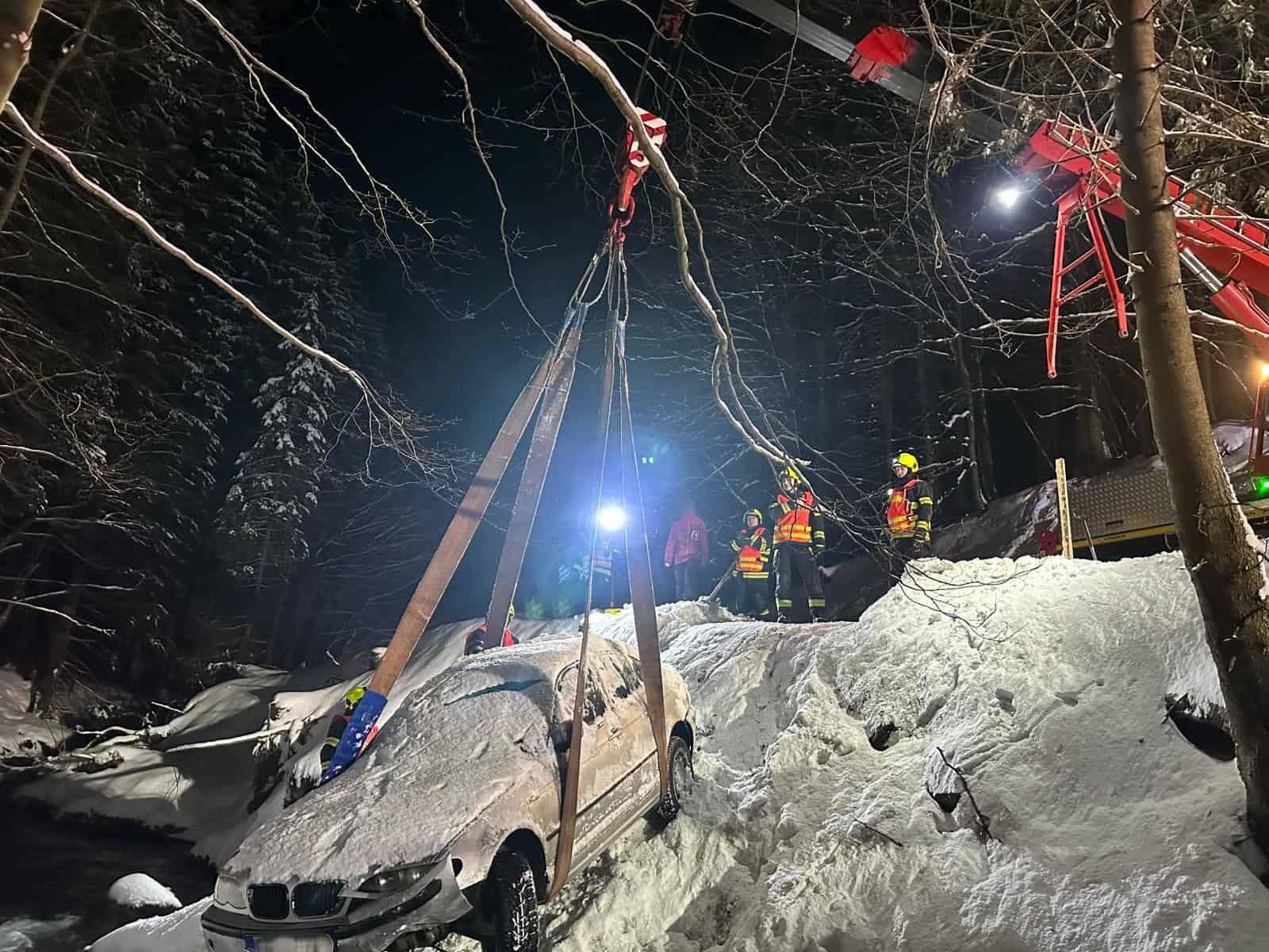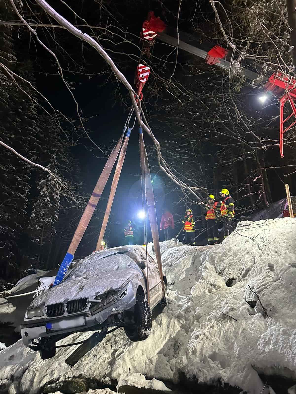 Pomocí techniky pak automobil, který byl již částečně zapadaný sněhem, postupně vyzdvihli z řečiště zpět na komunikaci. Celý zásah trval přibližně pětačtyřicet minut. Kolem půl desáté večer se jednotky vrátily na své základny.