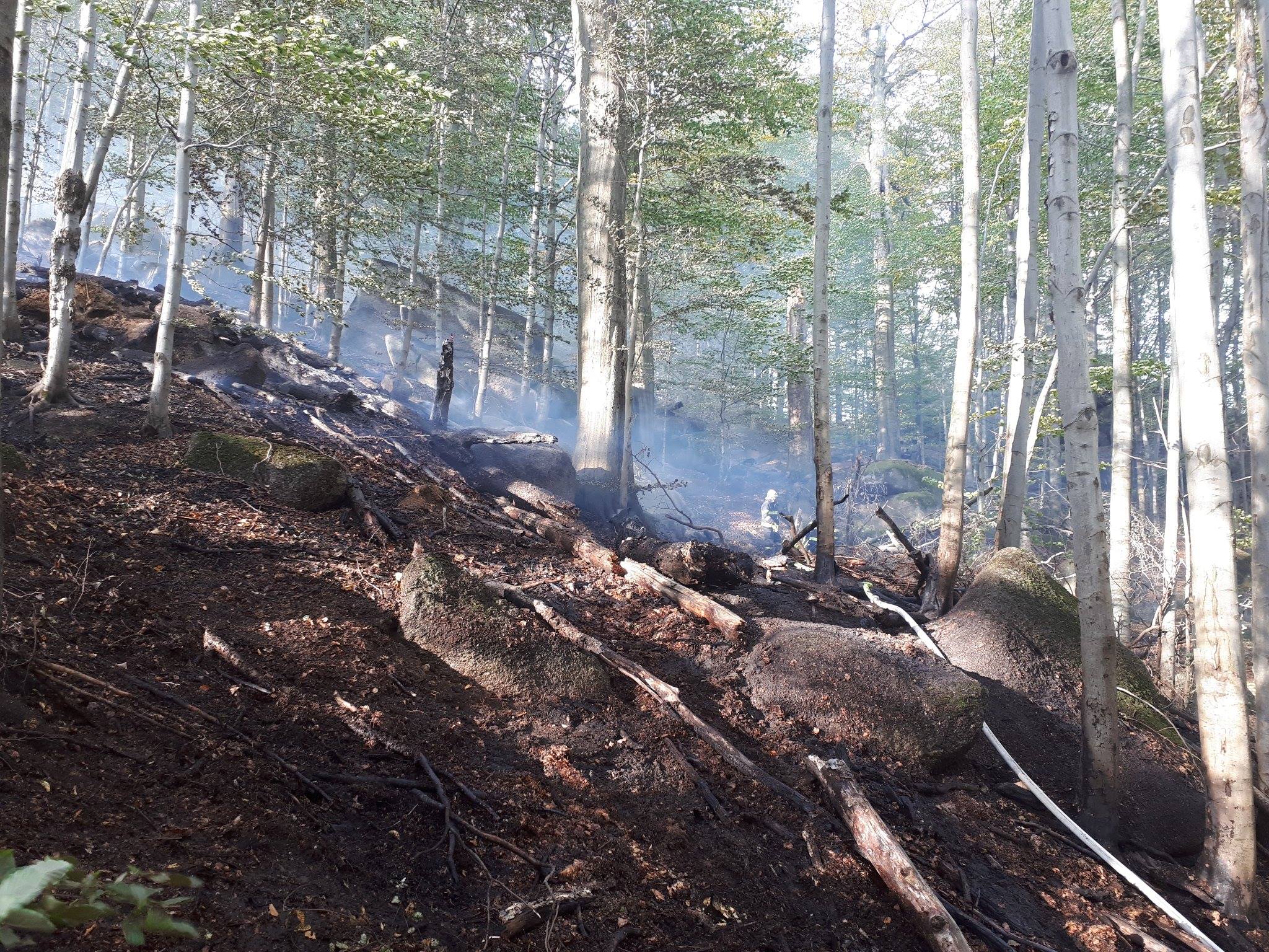 13:54 hodin nahlášena lokalizace. Požár se dále nešíří. Jednotky zůstávají na místě zásahu a dohašují skrytá ohniska požáruna ploše bezmála šesti hektarů lesního porostu.