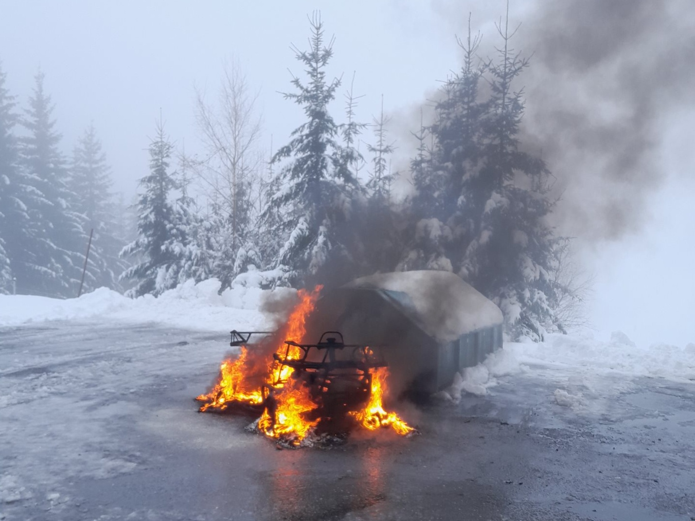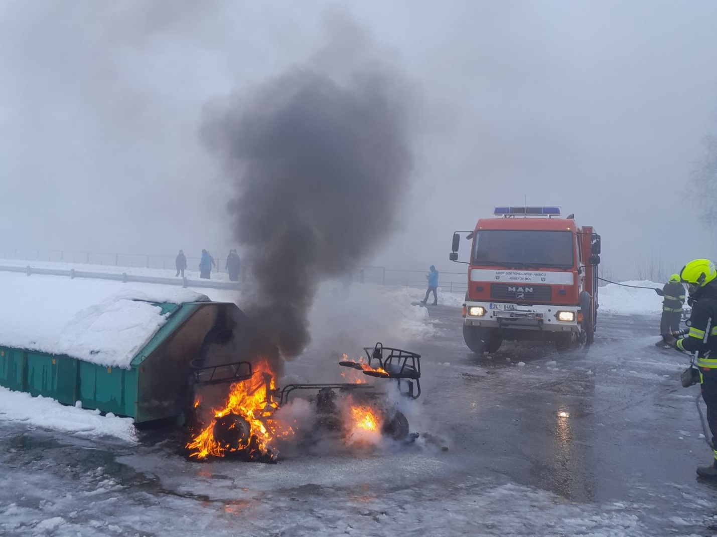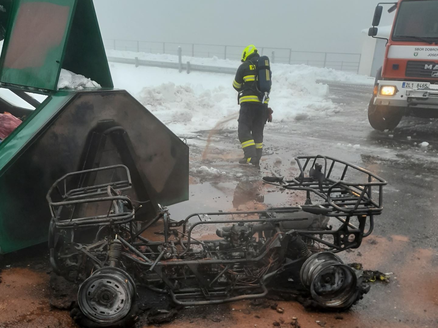 Čtyřkolka a kontejner v plamenech