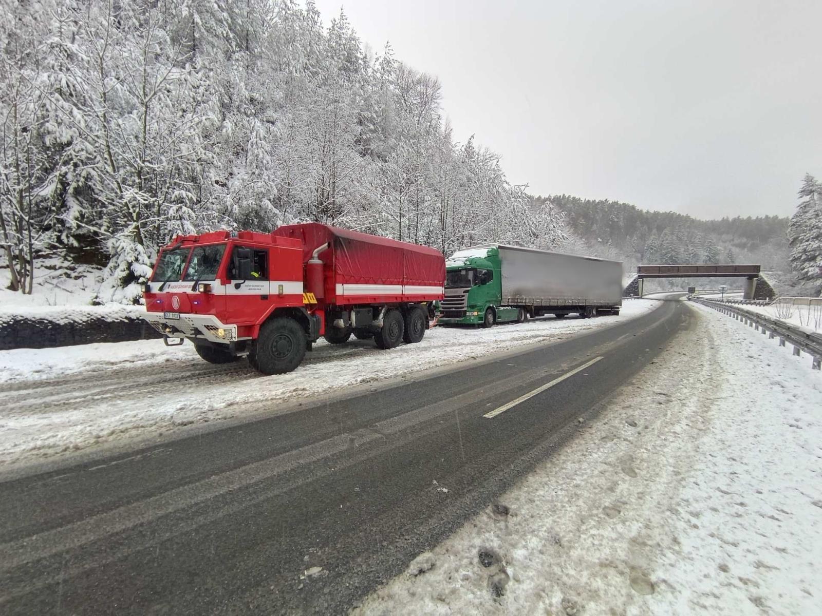 K náročným momentům víkendu patřila i akce na rychlostní silnici I/35 u Paceřic, kde v kopci uvízl kamion. Hasiči nasadili evakuační speciál z jablonecké stanice, aby pomohli rizikový úsek zprůjezdnit a zabránili blokaci dopravy.