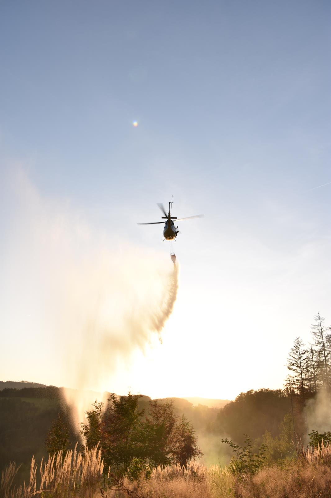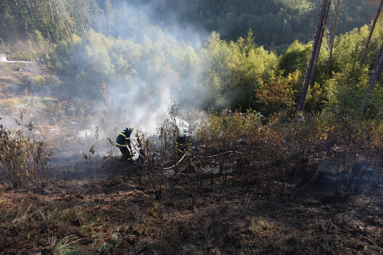 Vzhledem k rozsahu zasažené plochy byl na místo povolán také vrtulník Letecké služby PČR se speciálním bambivakem, který hasičům pomáhal s hasebními pracemi z vrchu. Vrtulník provedl celkem 19 shozů. Čerpací stanoviště pro vrtulník bylo zřízeno předurčenými dobrovolnými jednotkami, které plnily bambivak hasební látkou.  Zabránit šíření požáru se hasičům podařilo v 18:38 hod a likvidaci hlásil velitel zásahu v 19:28 hod.