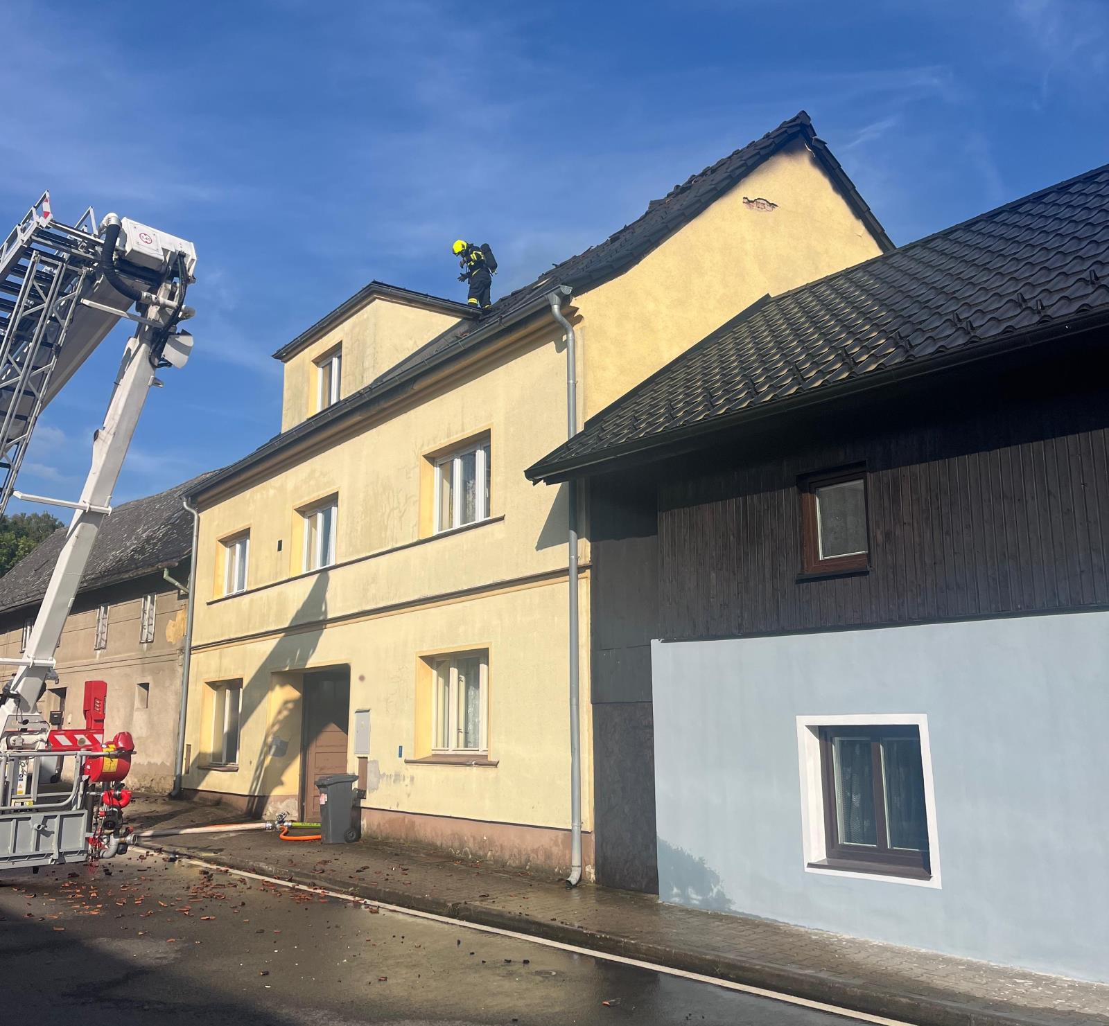 V neděli odpoledne zachvátil střechu rodinného domu v Žandově rozsáhlý požár. Vyhlášen byl druhý stupeň poplachu, hasiči museli nasadit i výškovou techniku.