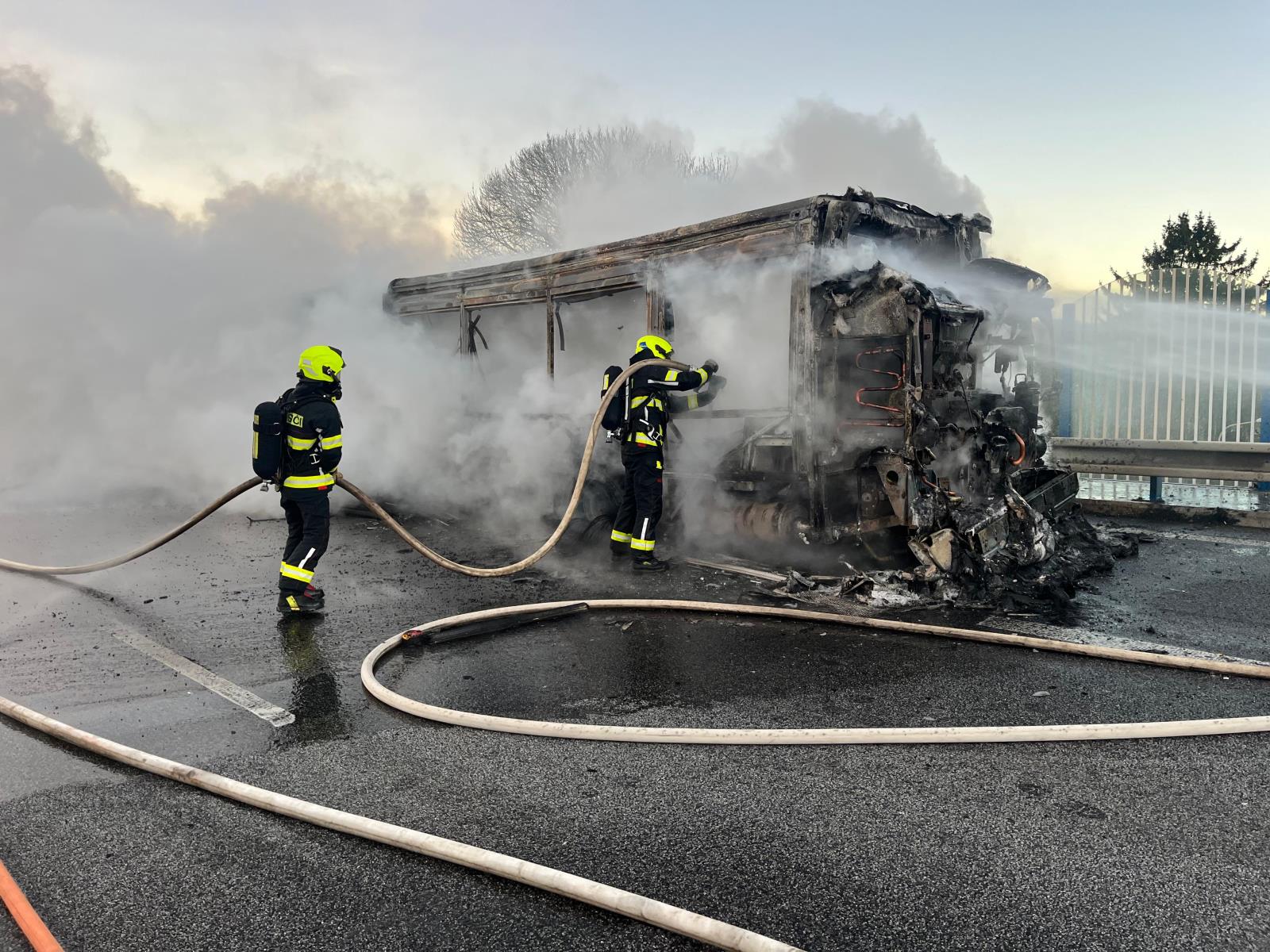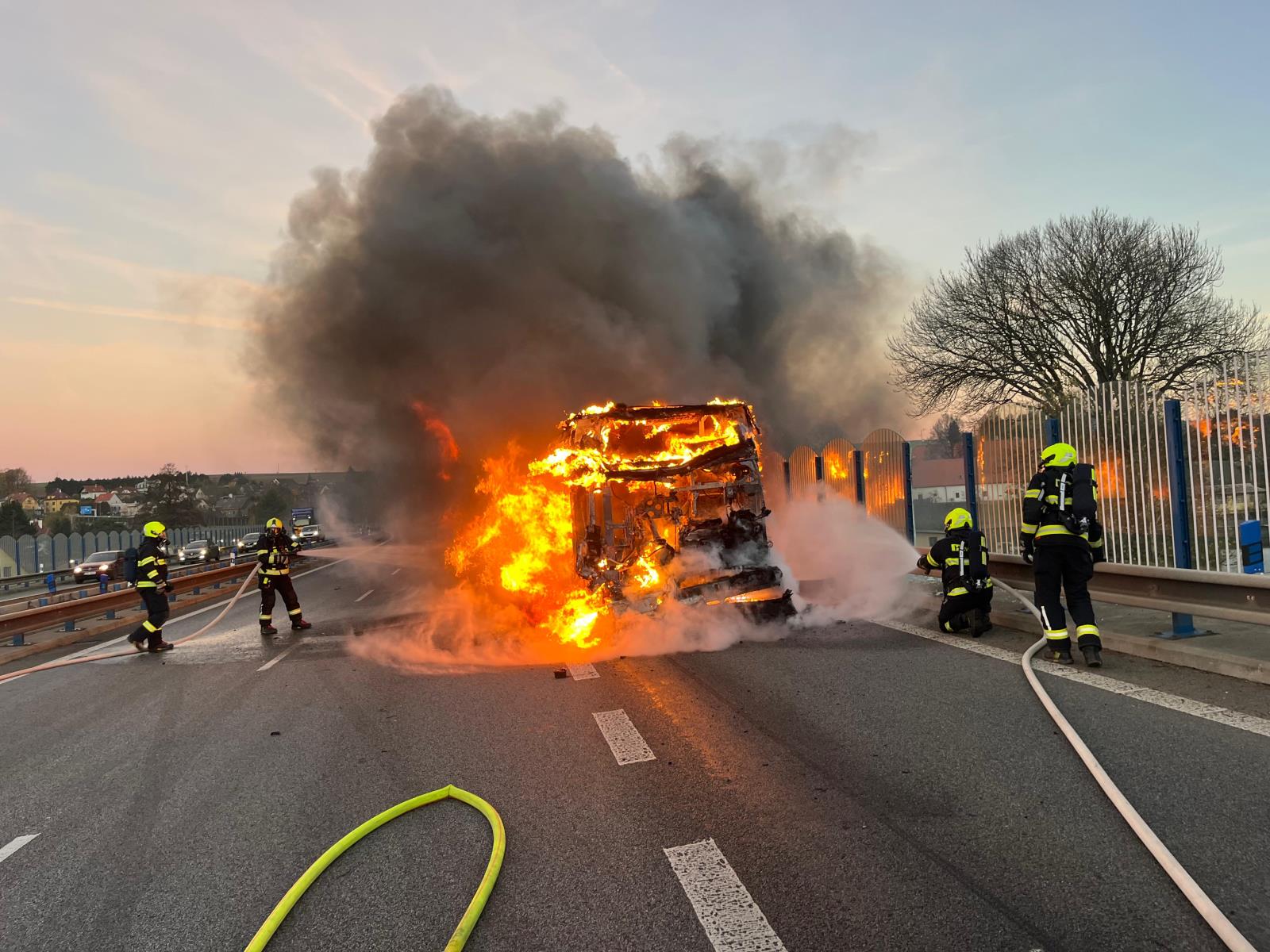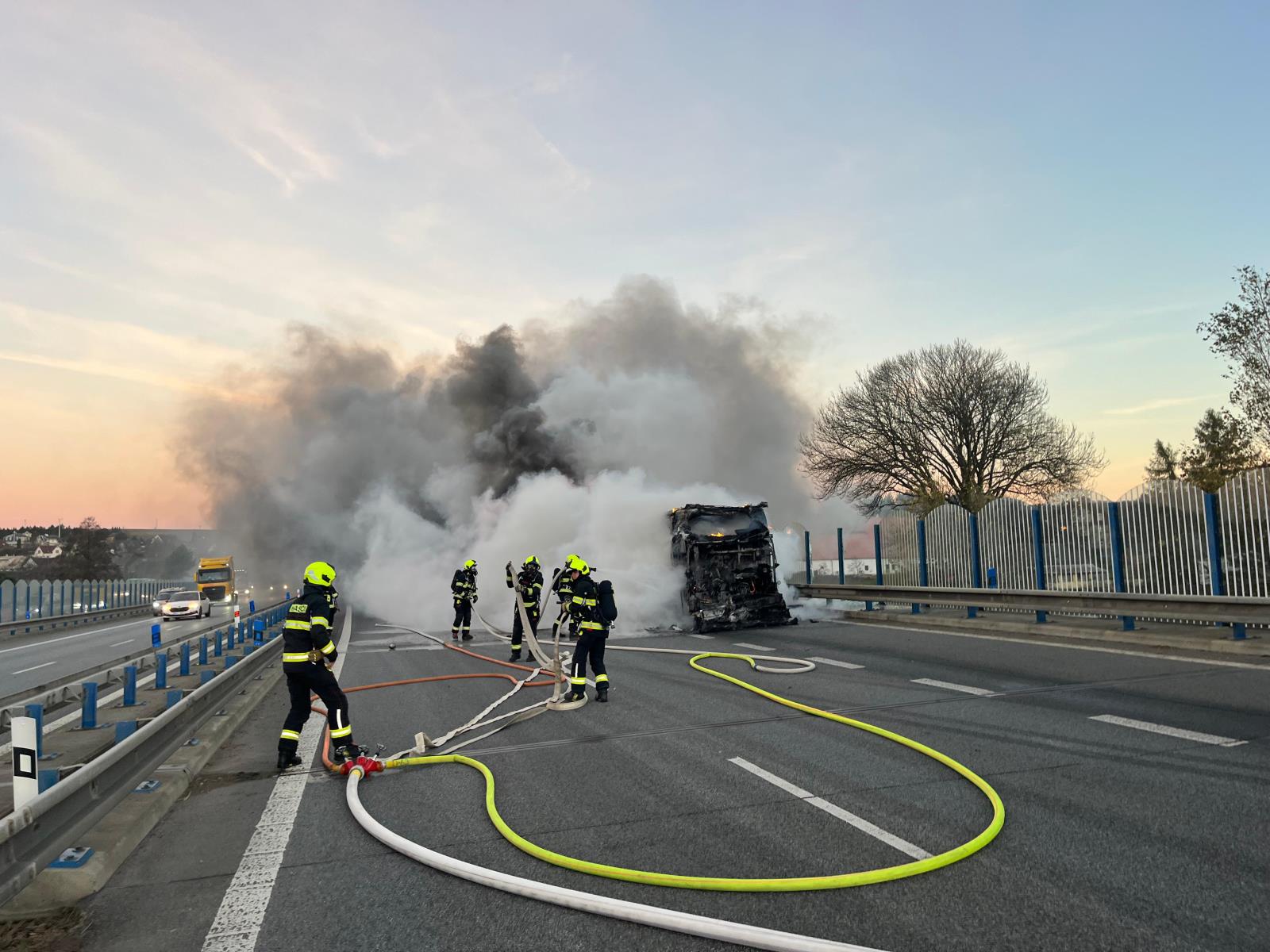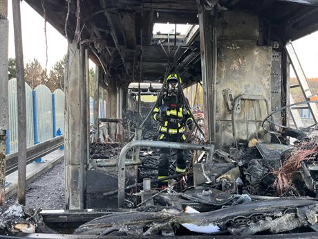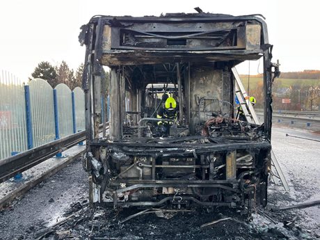 Ranní požár autobusu na hlavním tahu. Hasiči evakuovali třicet cestujících