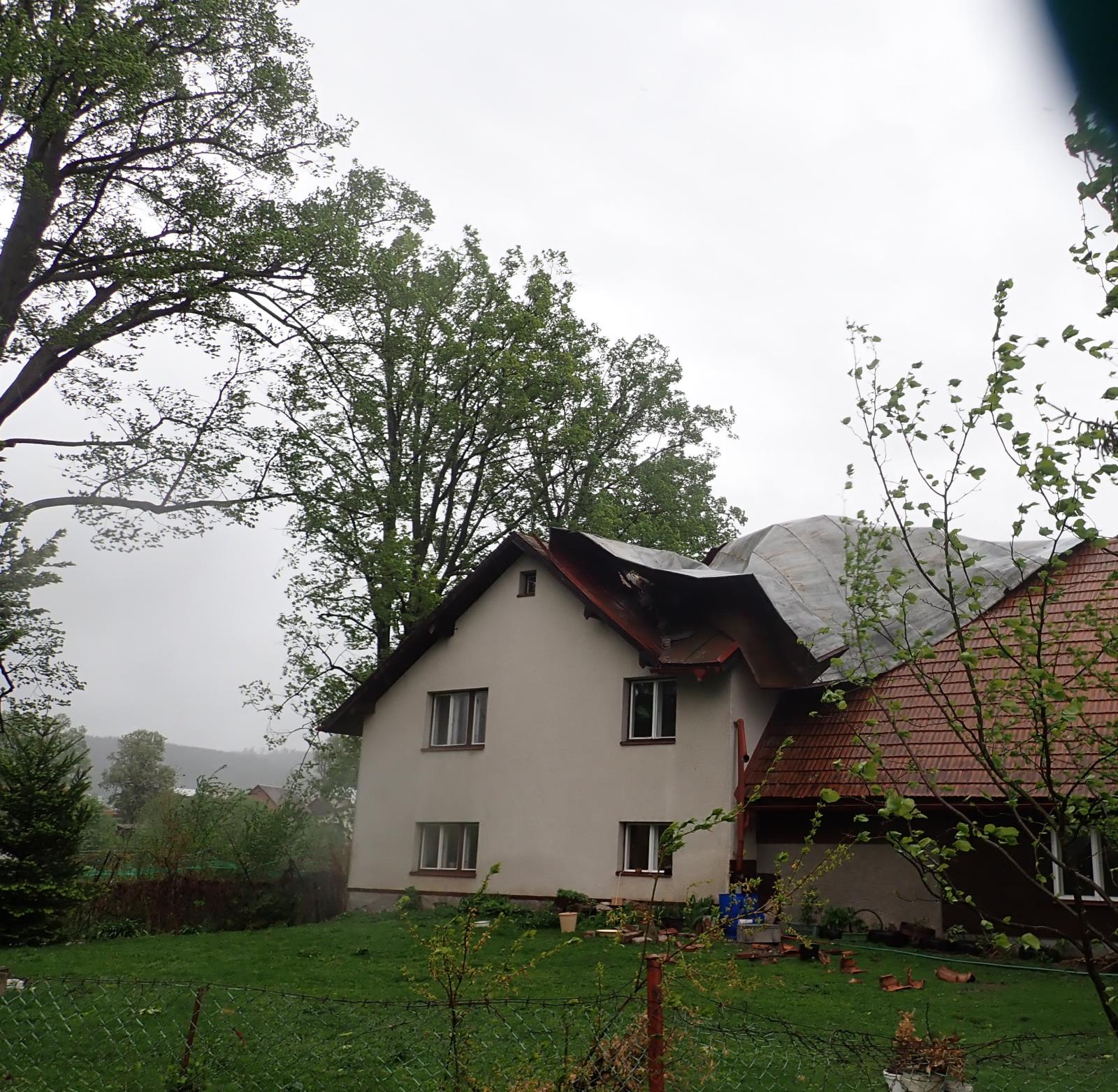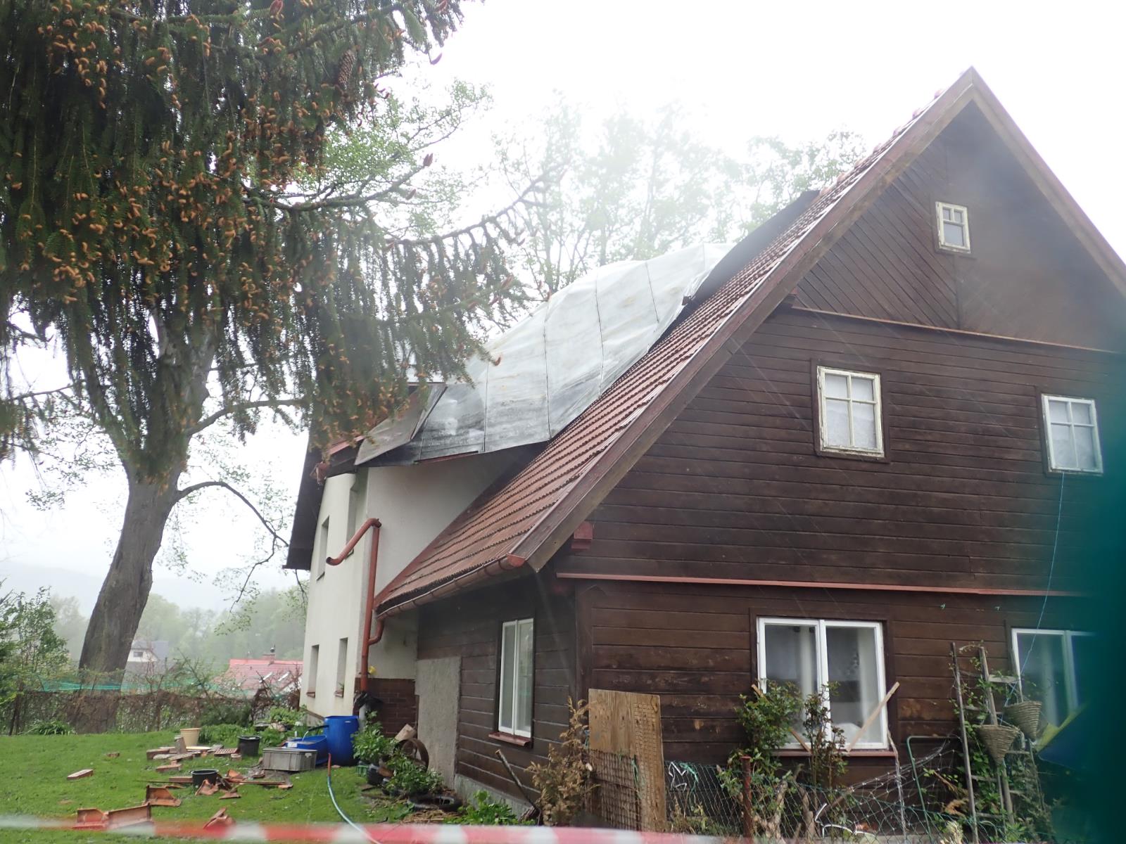 V Rozstání na Liberecku zase silný vítr utrhl střechu zahradního domku, která hrozila pádem k sousedům na zahradní altán. Hasiči po příjezdu střechu bezpečně zajistili.