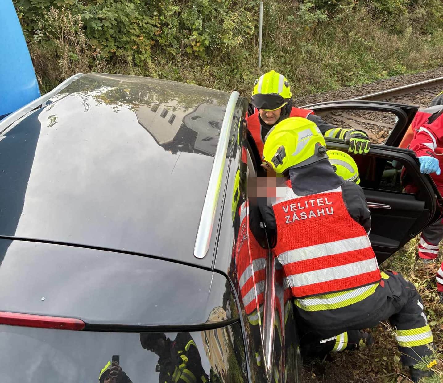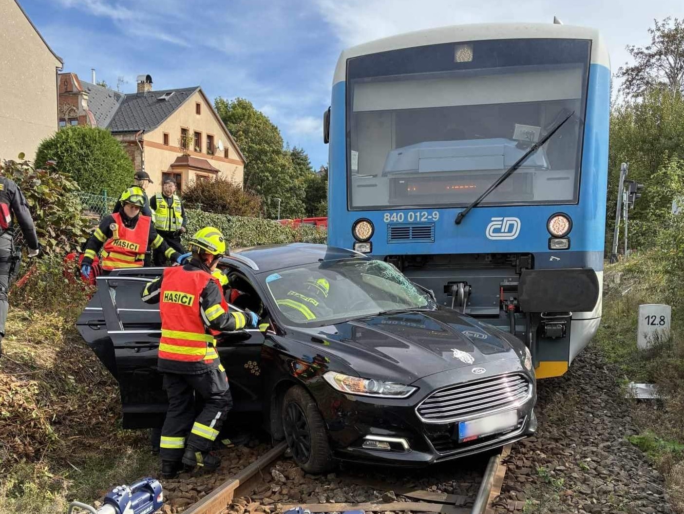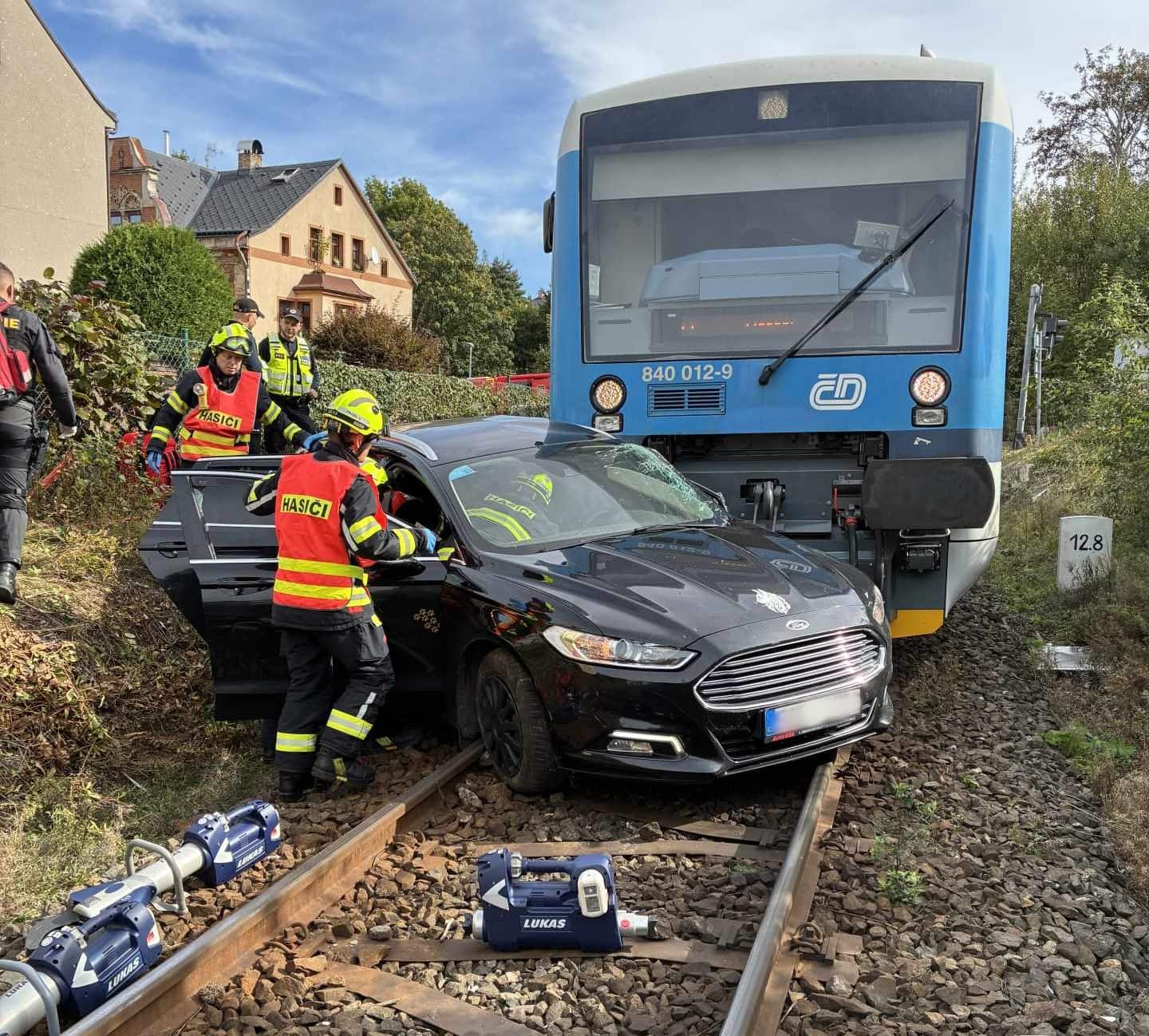 Srážka vlaku s osobním vozidlem: hasiči evakuovali 14 cestujících, řidiče museli vyprostit