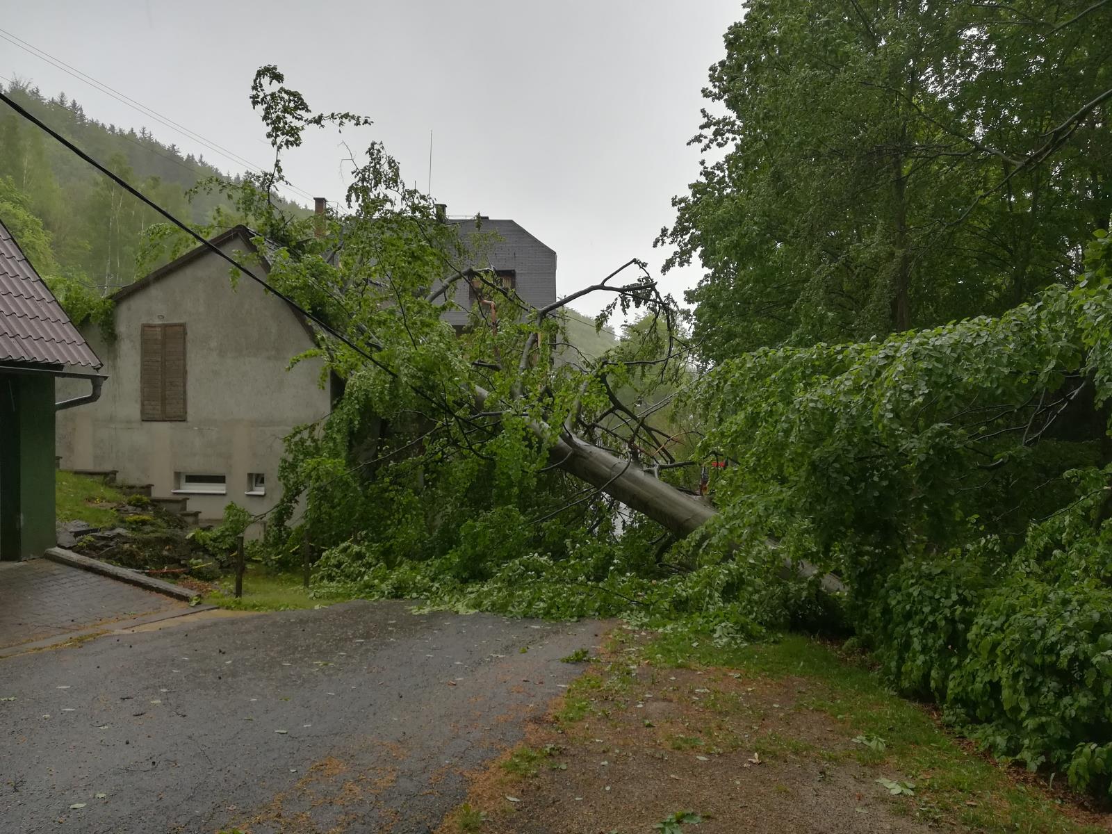 Po příjezdu na místo hasiči zjistili, že se jedná o vzrostlý buk, který takřka rozpůlil celou střechu domu. Vzhledem k jeho váze a umístění, nebylo v možnostech jednotky strom odstranit vlastními silami. Hasiči provedli označení nebezpečného prostoru. Starosta města zatím zajistil externí firmu s jeřábem, který celý kmen o váze několika tun, nadzvedl. Hasiči poté pomocí motorových pil provedli odvětvení stromu a jeho rozříznutí na dvě části tak, aby bylo možné ho pomocí jeřábu vyprostit ze střechy bez dalšího poškození. Následně byla komunikace zprůjezdněna a objekt předán majiteli, který si zajistil zabezpečení střechy proti dalším povětrnostním vlivům.