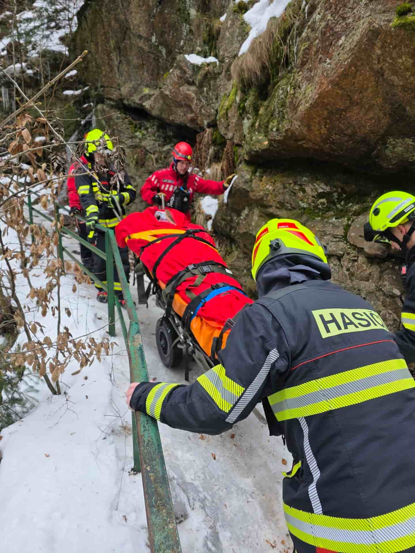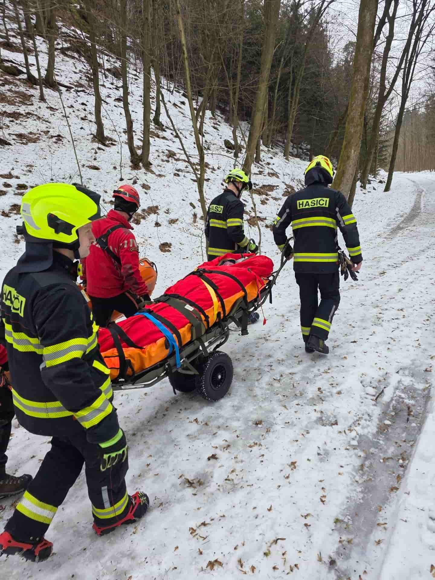 Hasiči poskytli zraněné osobě první pomoc a zároveň zajistili tepelný komfort. V chladném období může i krátká doba strávená bez pohybu na zemi vést k podchlazení, které zhoršuje celkový zdravotní stav. Následně byla osoba uložena do nosítek a hasiči ji přenesli terénem na začátek stezky.