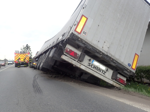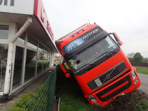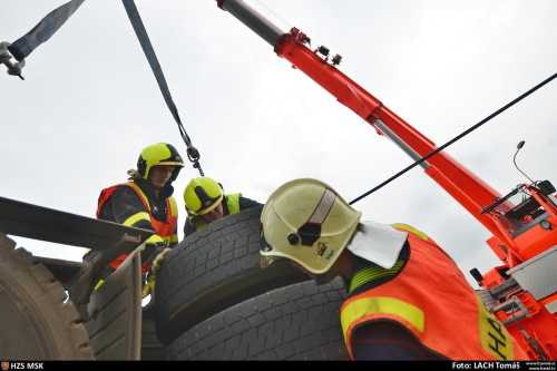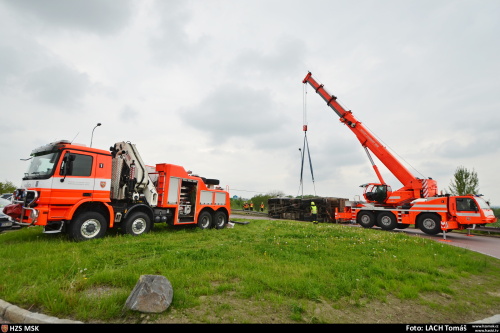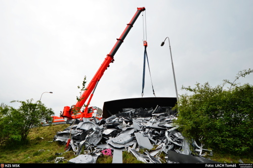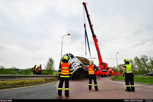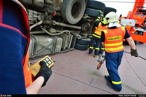 Z kontejneru na nákladním automobilu MAN, který skončil v Ostravě-Hrabové v Nebeského ulici na pravém boku na silničních svodidlech, na svahu ležela vysypána velká část kovového odpadu. Hasiči před vyprošťováním vozidla vyházeli kvůli odlehčení i další část nákladu. Doprava zde byla omezena jen částečně, vozidlo vyproštěno a postaveno na kola za hodinu.