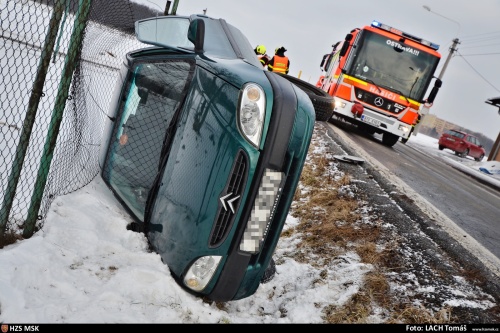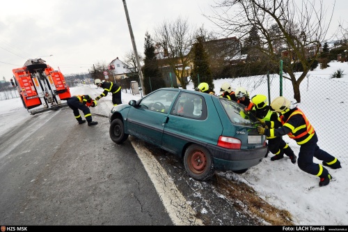 Profesionální hasiči z Ostravy-Zábřehu (HZS MSK) zasahovali v úterý 27.2.2018 ráno i s jejich vyprošťovacím speciálem Bizon na silnici mezi ostravskými částmi Výškovice a Stará Bělá u nehody osobního automobilu Citroën, které skončilo v příkopu na pravém boku. Řidička vyvázla bez zranění.