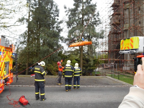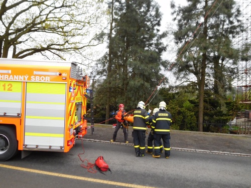 K záchraně osoby z výšky 35 metrů použil lezecký tým lana i automobilový žebřík AZ 30 Camiva.
