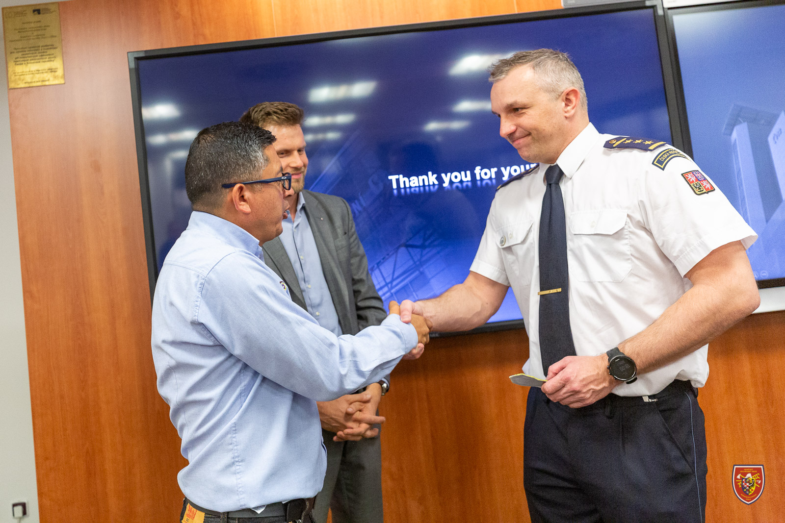 Ředitel Hasičského záchranného sboru Moravskoslezského kraje plukovník Ing. Radim Kuchař přivítal ve čtvrtek 7. dubna 2022 odpoledne generálního ředitele Dirección Nacional de Bomberos de Colombia a vrchního velitele Charlese Wilbera Benavidese Castilla spolu s dalšími zástupci vedení kolumbijských hasičů.