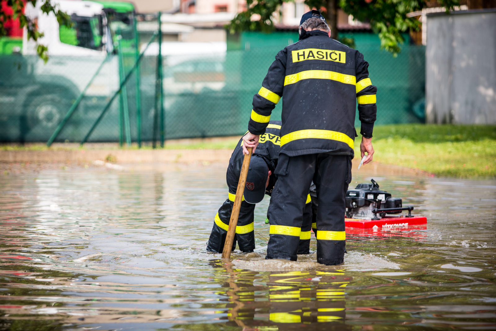 Hasiči museli před záplavou ochránit trafostanici - vykopali několik provizorních kanálů ze vzniklé laguny do řeky a tím se jim podařilo udržet hladinu vody pod kritickým místem.