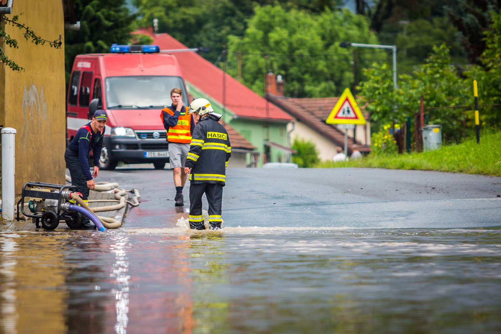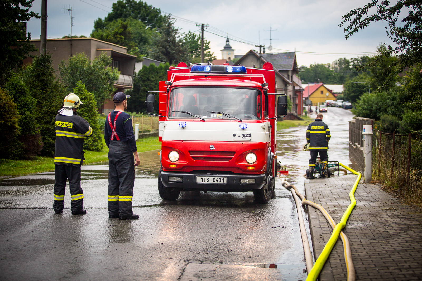 Hned šest hasičských jednotek zasahovalo v Jeseníku nad Odrou, kde přívalový déšť zatopil kromě jednotlivých sklepů rovněž prostory v centru obce.