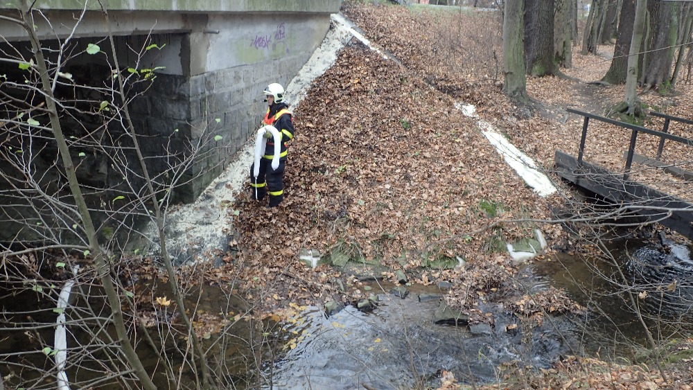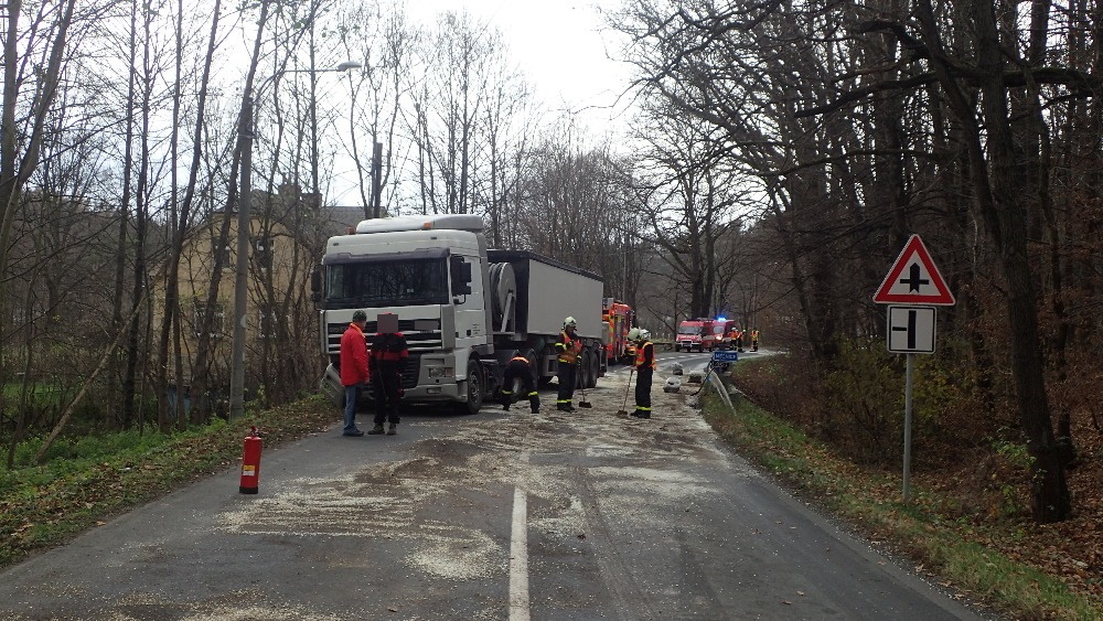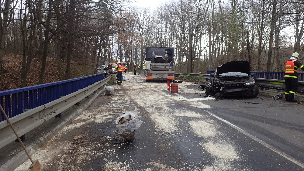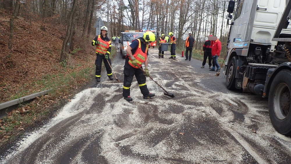 Při příjezdu jednotky na místo nehody bylo průzkumem zjištěno, že došlo k nehodě osobního vozidla s nákladním automobilem. U nákladního automobilu došlo k úniku cca 200 l motorové nafty, která se rozlila na komunikaci a také do blízkého potoku. Velitel zásahu nechal ihned na vodní tok instalovat nornou stěnu, která bránila k dalšímu šíření nafty a povolal na místo posilové jednotky. Uniklou naftu posypali nasákavým sorbentem. Hasiči dále asistovali u naložení jednoho havarovaného automobilu na vozidlo odtahové služby.