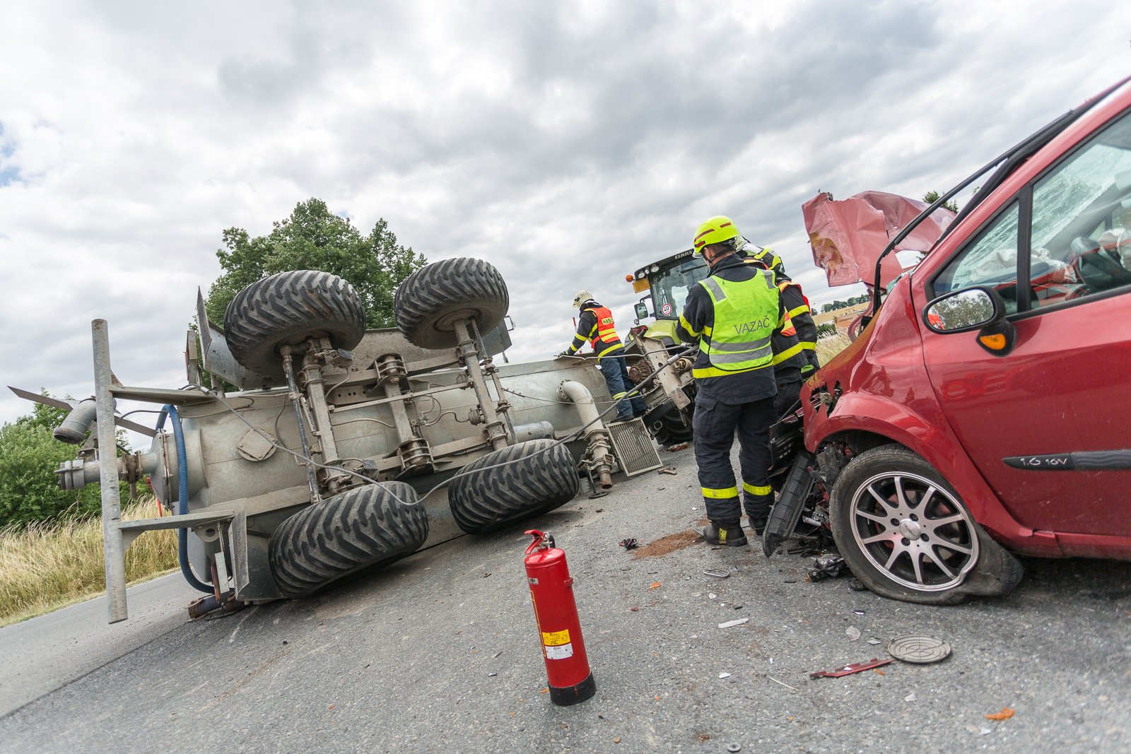 Dvě jednotky hasičů zasahovaly ve Svatoňovicích na Opavsku, kde se střetl osobní automobil s vlečkou traktoru.