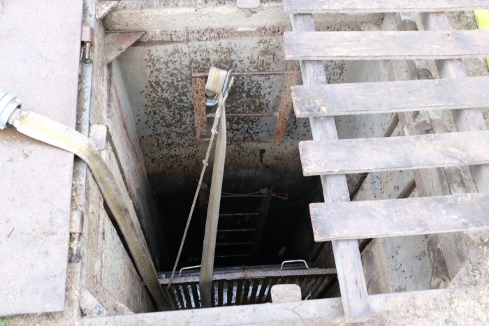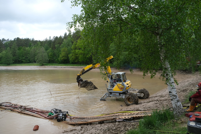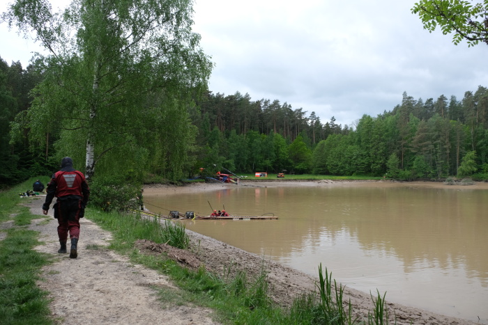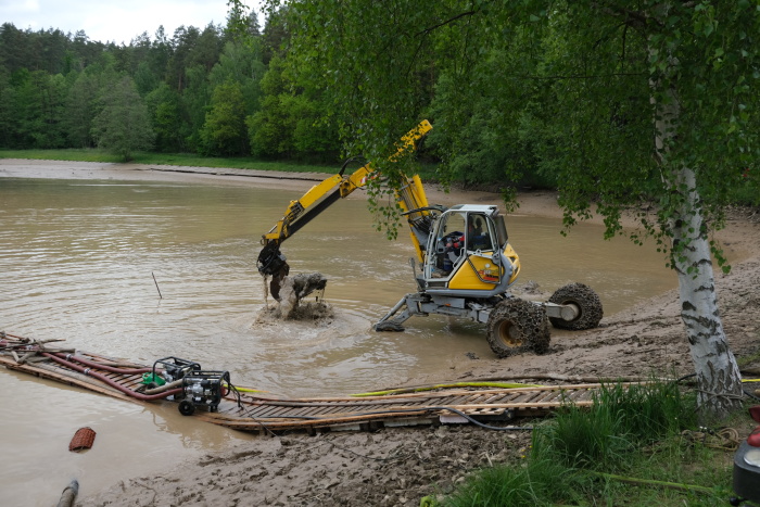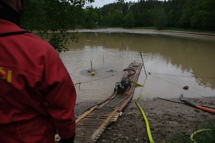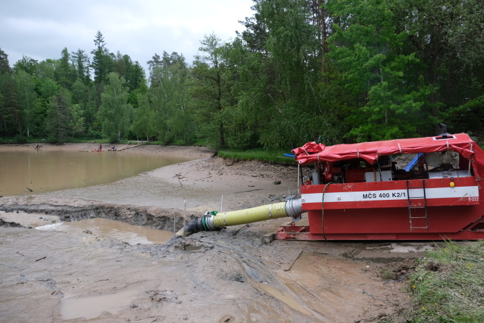 Tím významně poklesl tlak vody na hráz a také se usnadnilo náročné hledání metráky bahna zaneseného odtoku s betonovým zpevněním pod neprůhlednou hladinou - např. dlouhými tyčemi i s potápěči ze ZÚ Hlučín (hmatem). Na odčerpávání bahna pod hladinou i ze svislé štoly (požeráku), vedoucí středem hráze dolů do zaneseného odtokového potrubí, použili několik dalších sacích či výtlačných agregátů a hadic.