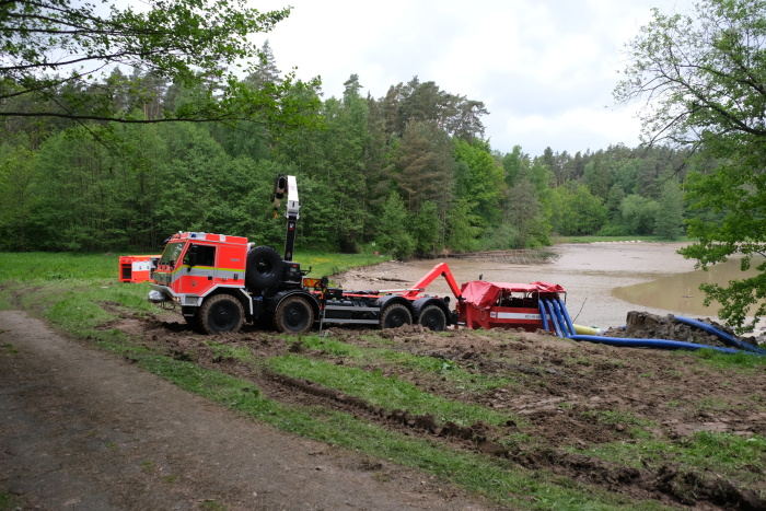 Hasiči z HZS MSK přivezli dvě velkokapacitní čerpací stanice Sigma (v majetku Státních hmotných rezerv) a Somati. První z nich může přečerpat až 40 m3 vody za minutu, druhá až 8 m3 za minutu. Ty pracovaly od středečního dopoledne s menšími přestávkami kvůli přesunu na lepší místa až do pátečního poledne, kdy se podařilo snížit hladinu přehrady u hráze o více než dva metry.