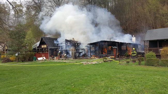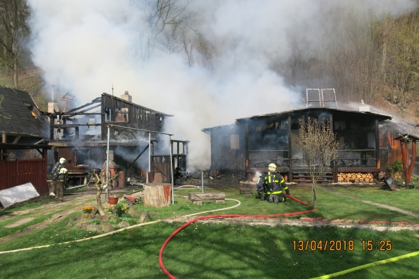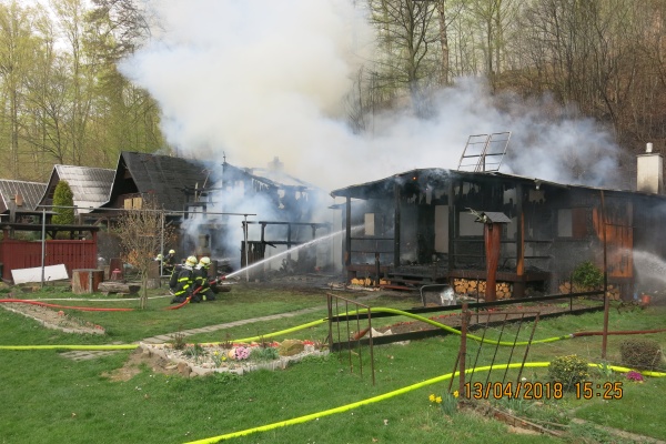 Celkem 10 hasičských jednotek likvidovalo v pátek 13.4. 2018 odpoledne požár tří rekreačních chatek v chatové osadě v Hlučíně – Bobrovníkách u řeky Opava. Při požáru byla popálena jedna osoba.