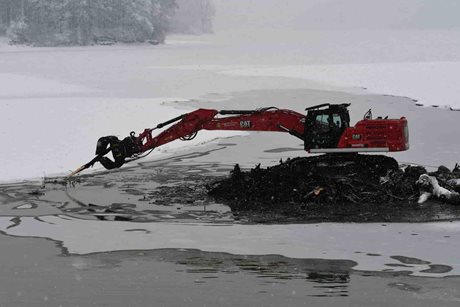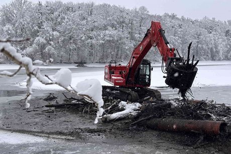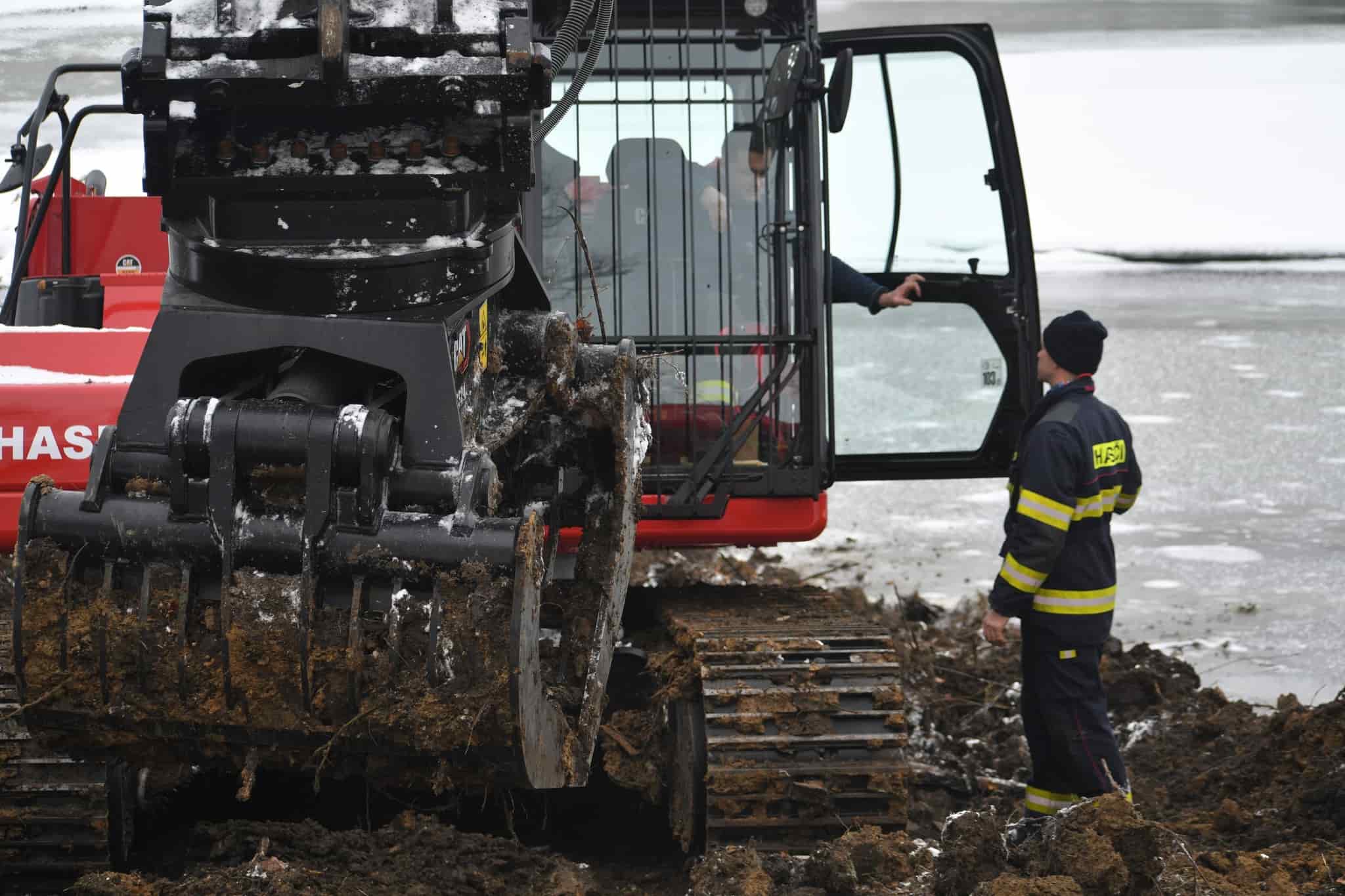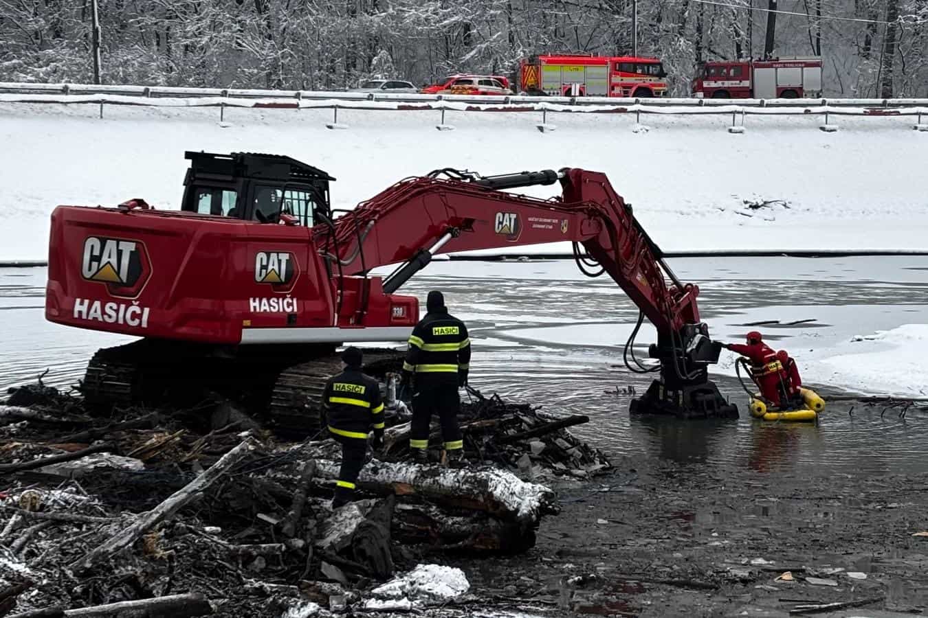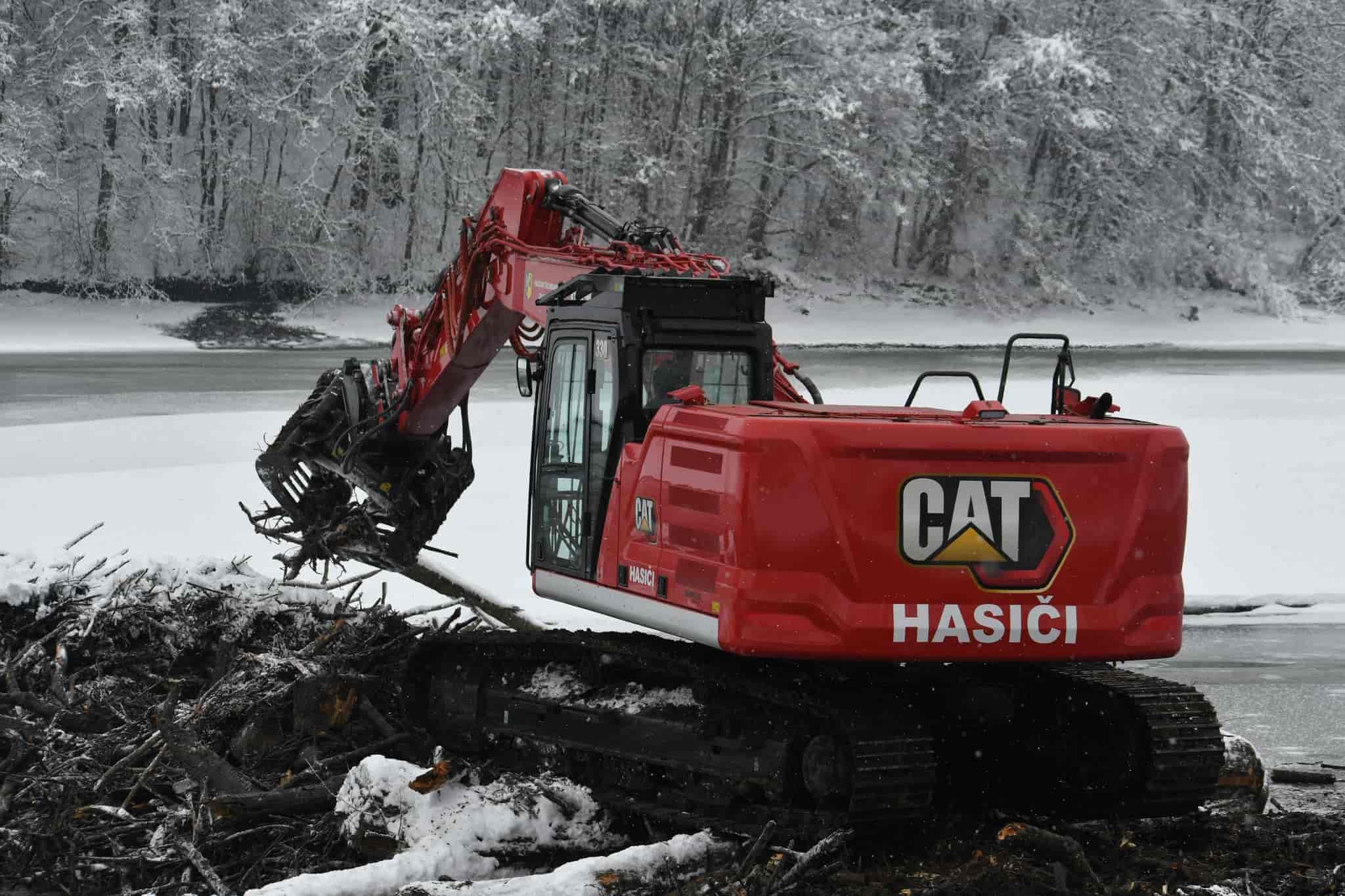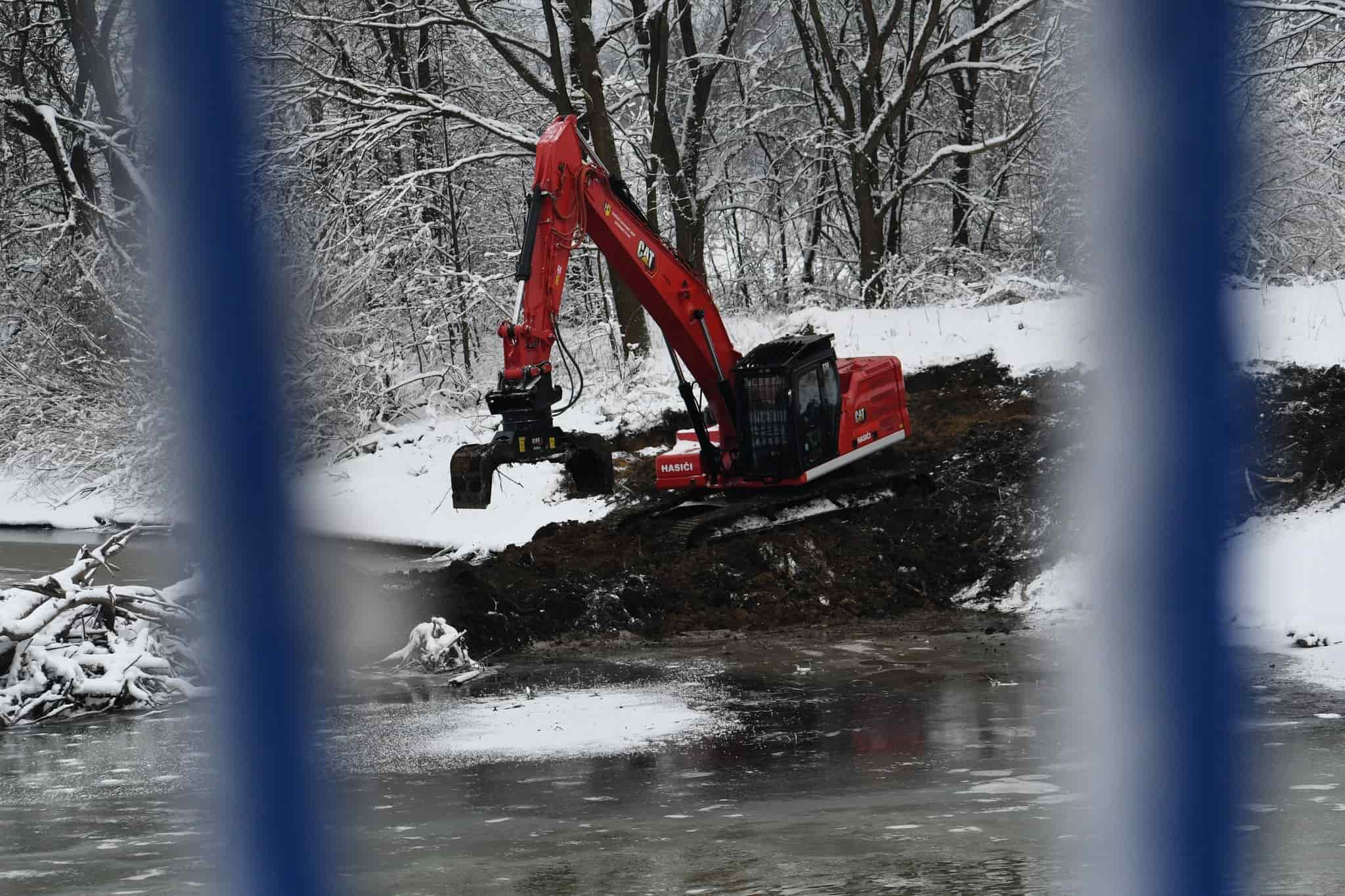 Hasiči nasadili pásové rypadlo k odklizení naplaveného dřeva