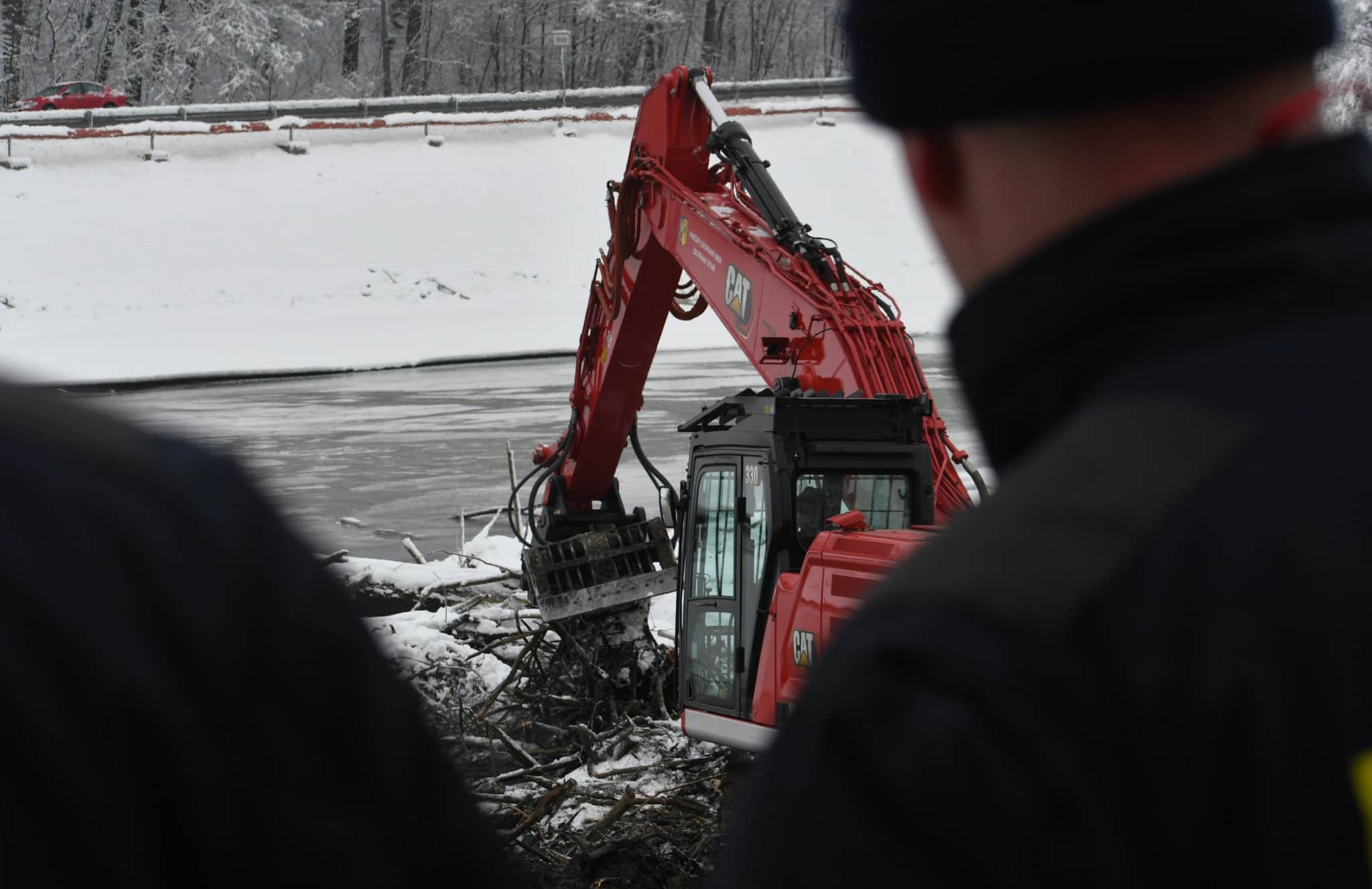 Na místě zasahují profesionální hasiči z dislokace Hlučín a dobrovolné jednotky Těrlicko. Pro práci je využito pásového rypadla CAT 330, které umožňuje bezpečné vytahování kmenů z podmáčeného a těžko přístupného terénu. Operace probíhá postupně, aby nedošlo k poškození zařízení vodního díla.