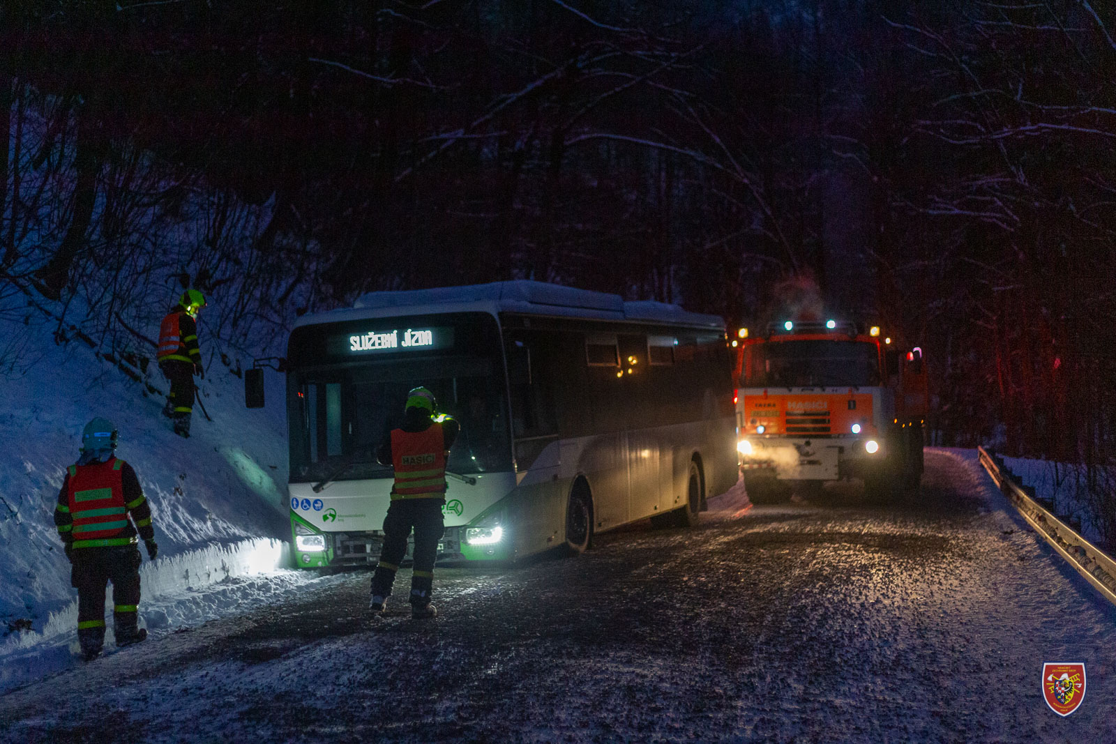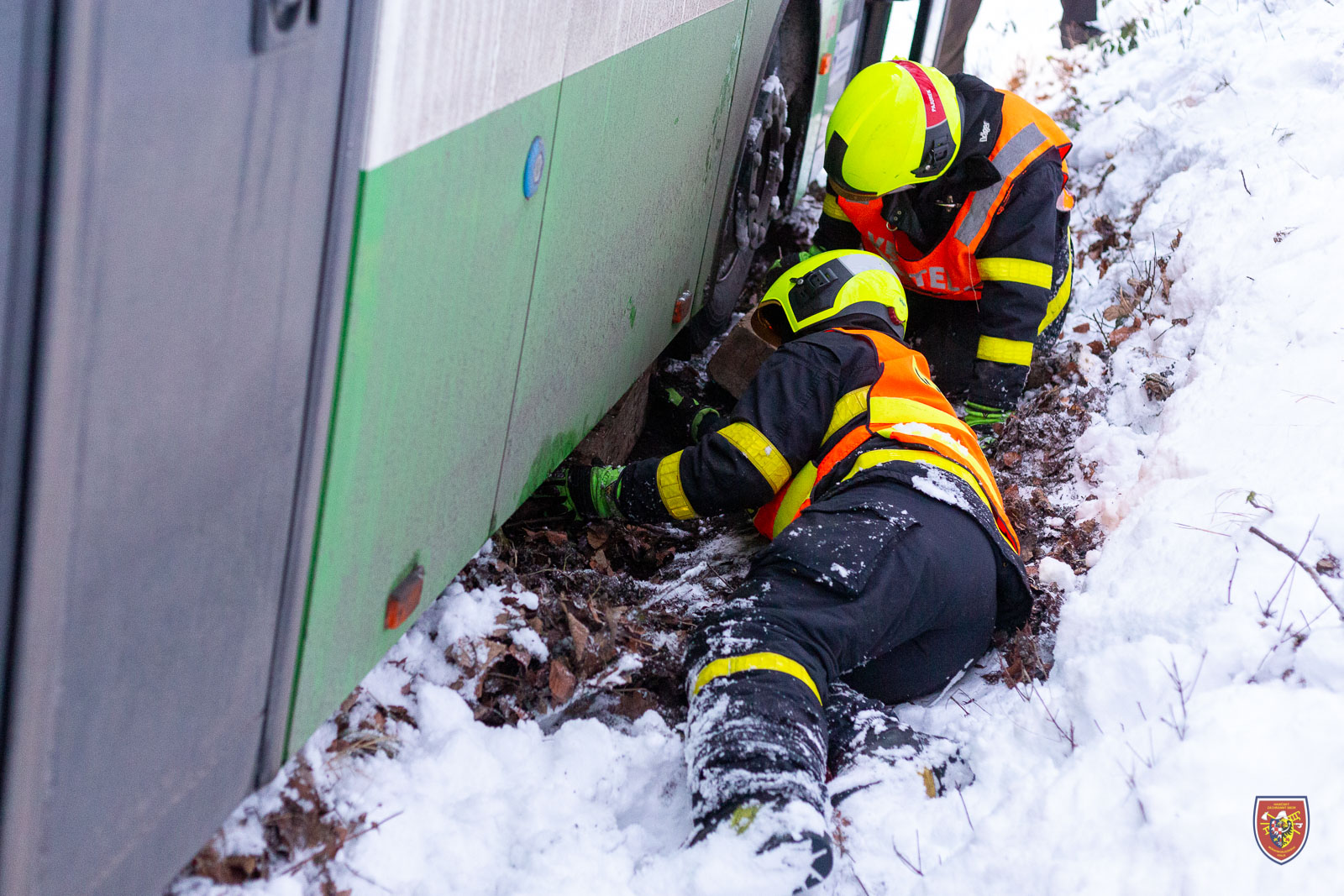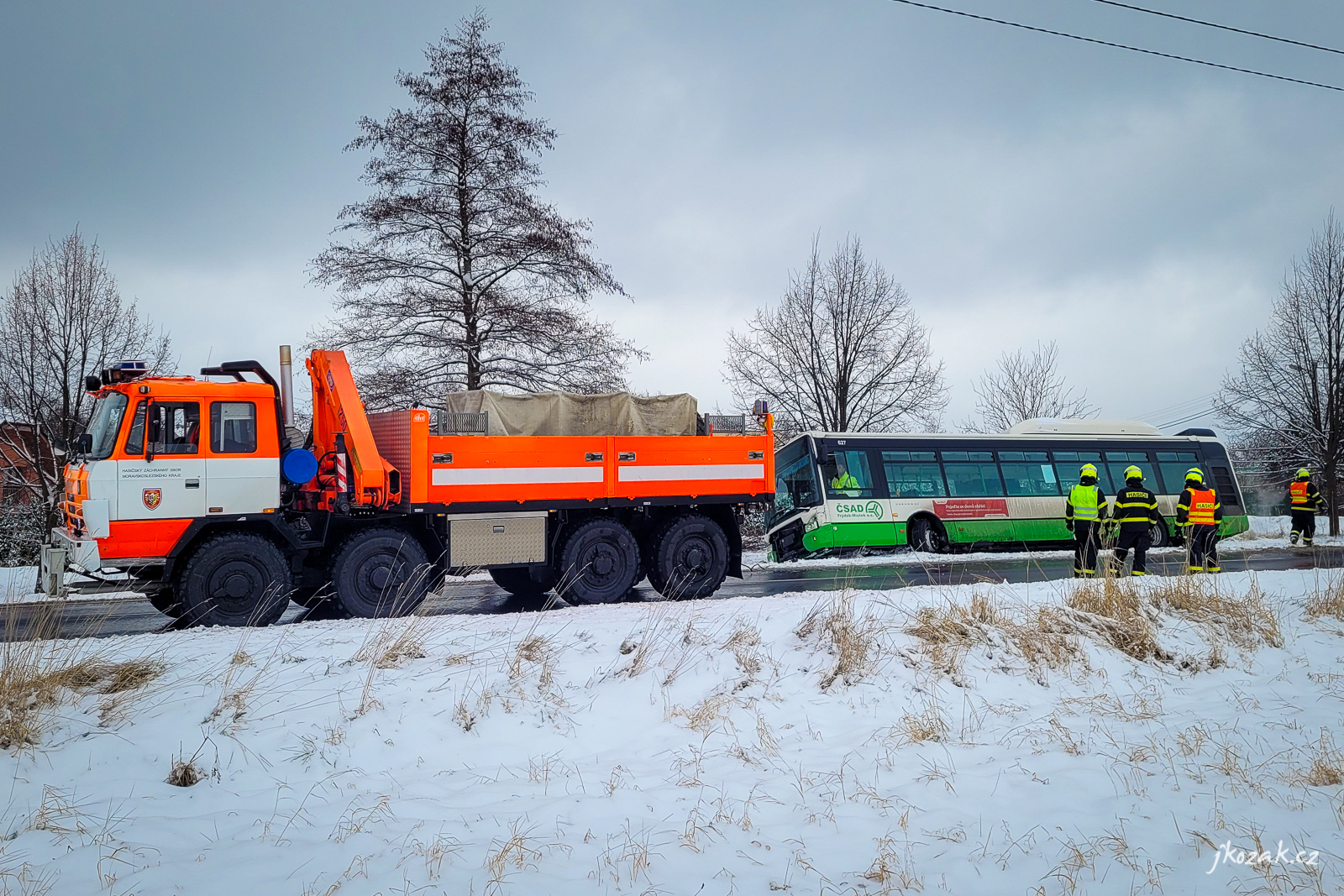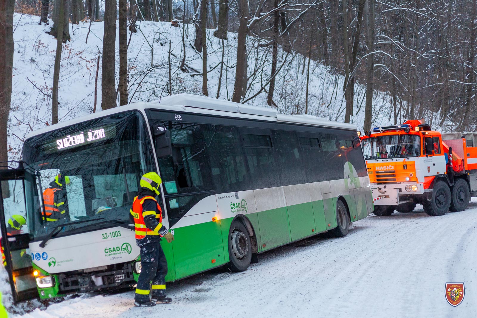 Podobně řešili zapadlý autobus o den dříve - tedy v sobotu 22. ledna 2022 - dopoledne hasiči v Lískovci. I tady pomohla okolo desáté hodiny vyprošťovací Tatra ze stanice HZS MSK Frýdek-Místek a i zde se nehoda obešla bez zranění.