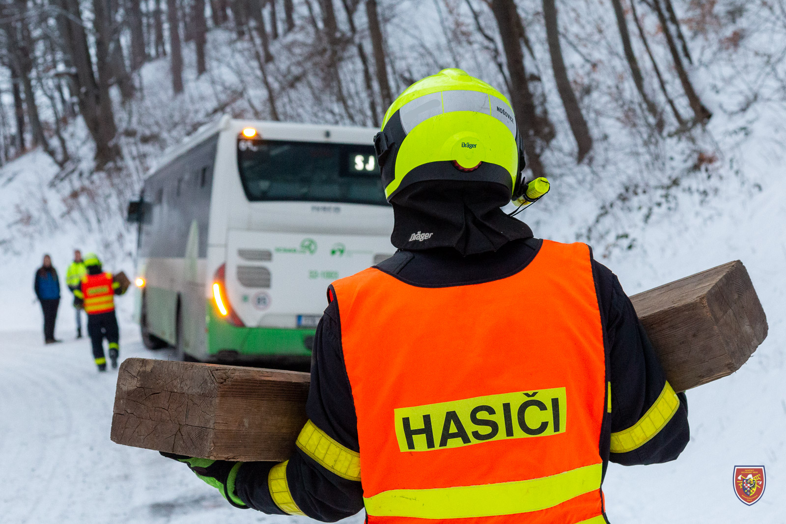 V sobotu večer - čtvrt hodiny po osmnácté hodině - uvízl autobus i v obci Pražmo. Na pomoc mu vyjeli hasiči ze stanice HZS MSK Nošovice, kteří po příjezdu zjistili, že se vůz zasekl na kameni skrytém pod novou sněhovou pokrývkou.