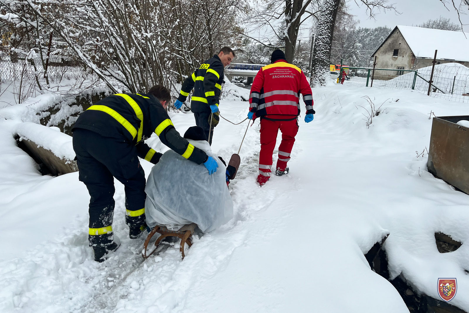 Krátce po půl desáté ráno vyrazili hasiči ze stanice Frýdek-Místek na pomoc posádce zdravotnické záchranné služby, která potřebovala transportovat ženu z domu do sanitního vozu. Hasiči k transportu využili čerstvě napadaného sněhu a sousedovy saně, se kterými ne ně již její soused čekal.