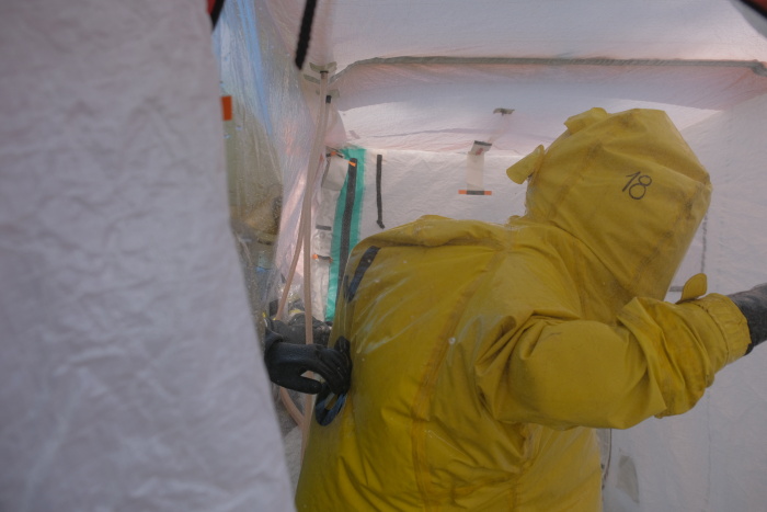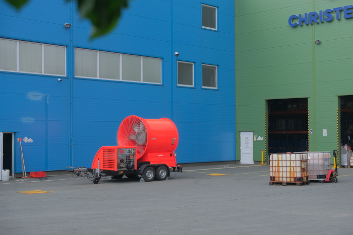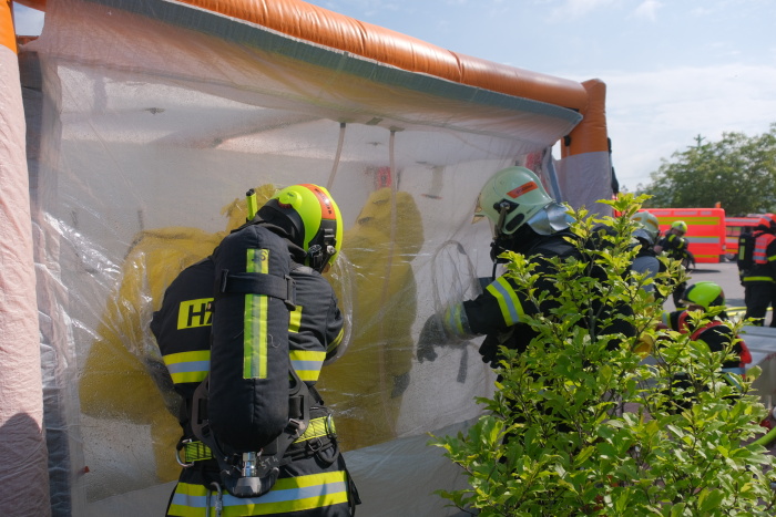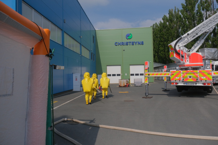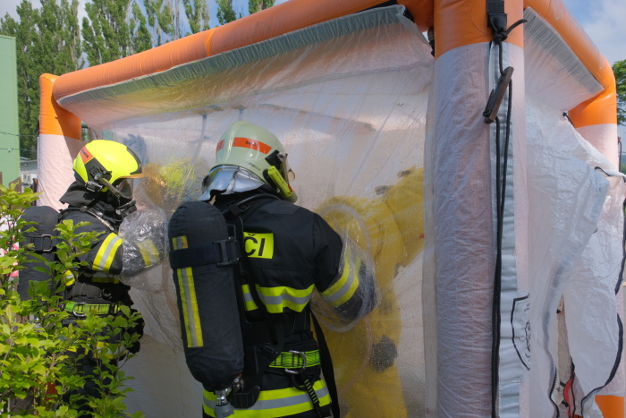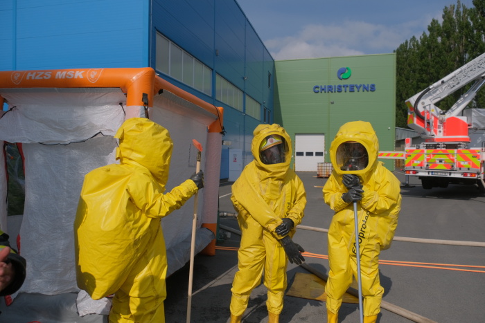 Hasiči od ranních šesti hodin nejprve vyvezli v protichemických oblecích IBC kontejner s chemickými látkami z haly na dvůr a několik hodin odvětrávali vnitřní prostory, kde se část oranžového mraku držela, a to hlavně pomocí mobilního velkokapacitního ventilátoru z Ostravy. V protichemických oblecích odstraňovali uvnitř haly zbytky kapaliny na podlaze, když ji pečlivě ředili vodou. Hasičům s epodařilo zachytit všechnu kapalinu uvnitř areálu firmy.