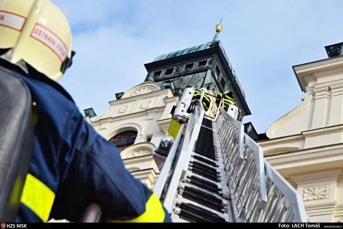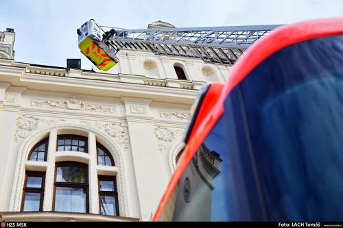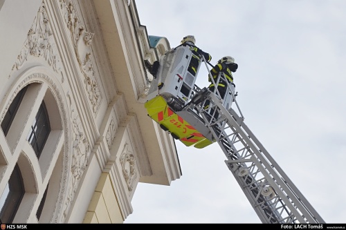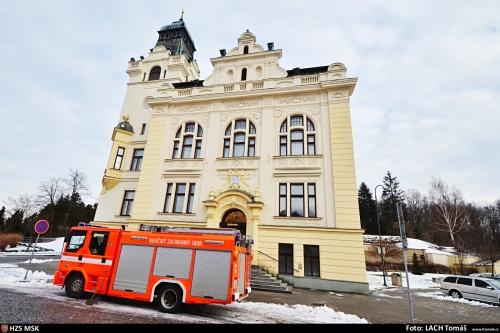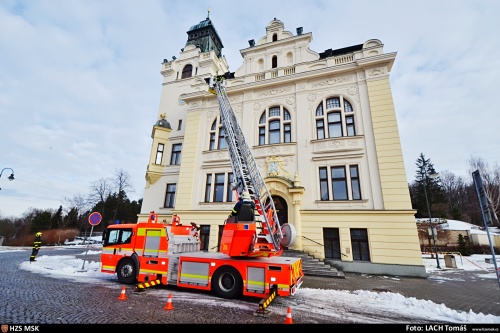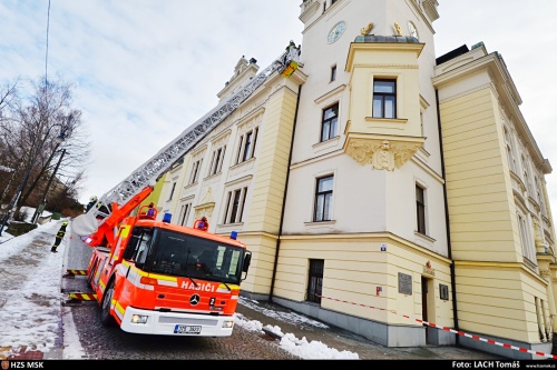 Profesionální hasiči ze stanice Ostrava-Fifejdy (HZS MSK) shazovali v úterý 29.1.2019 dopoledne nebezpečný sníh a led se střechy slezskoostravské radnice, kde hrozilo zranění kolemjdoucích. Z Fifejd musel proto vyjet výsuvný automobilový žebřík AŽ 30 Camiva.