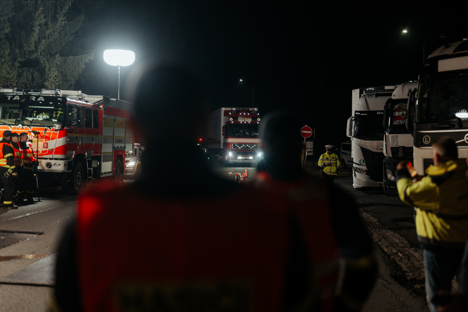Od čtvrtečního rána prošly dekontaminací desítky kamionů převážejících zvířata a živočišné produkty. Hasiči hlásí, že systém funguje bez problémů a že průjezd přes hranice je plynulý.