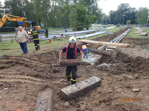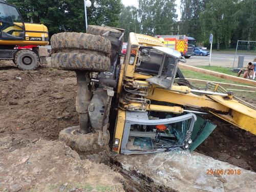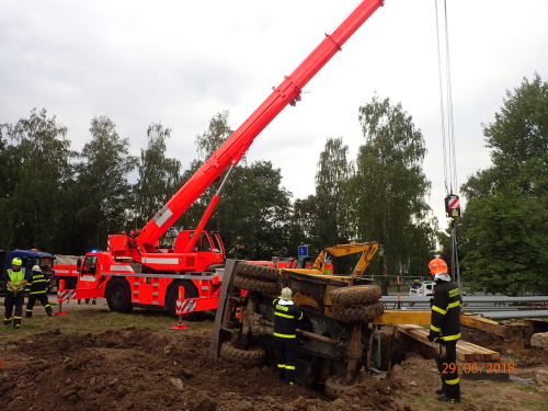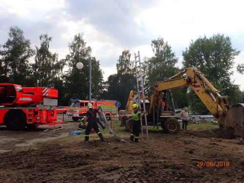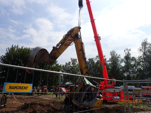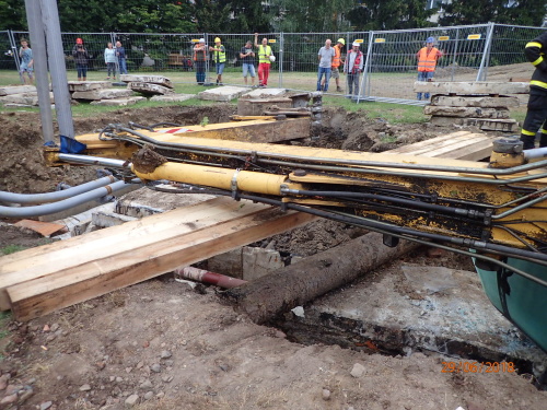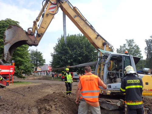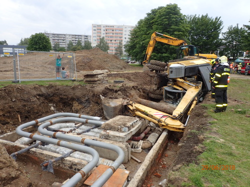 Dvě jednotky profesionálních hasičů (HZS MSK) zasahovaly v pátek 29.6.2018 odpoledne v Karviné-Hranicích, kde se na měkkém podloží převrátil bagr na bok do výkopu s plynovým a teplovodním potrubím a při nešetrném vyprošťování hrozilo poškození inženýrských sítí. Téměř po třech hodinách cizelérské činnosti hasičů byl stavební stroj vytáhnut mimo výkop pomocí těžké hasičské techniky - bez porušení potrubí.