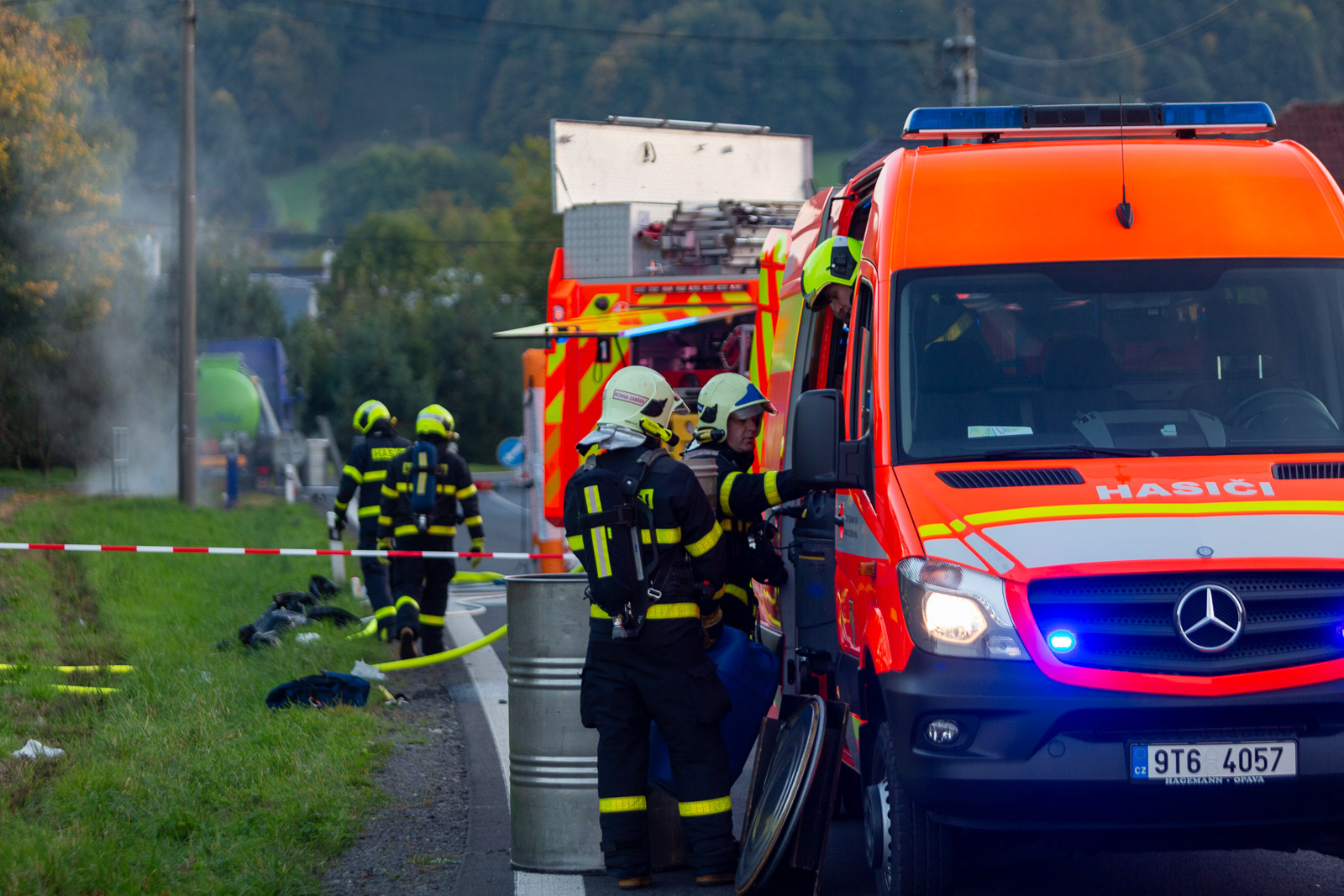 Čtrnáct hasičských jednotek včetně chemické laboratoře zasahovalo v pondělí 4. října 2021 odpoledne u úniku kyseliny chlorovodíkové z návěsové cisterny v Bludovicích na Novojičínsku.