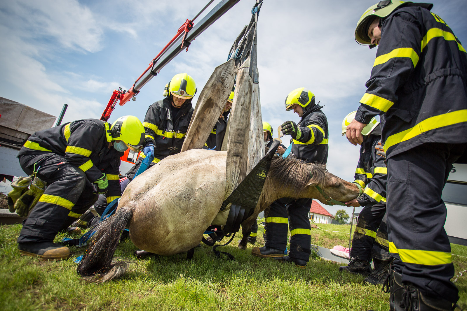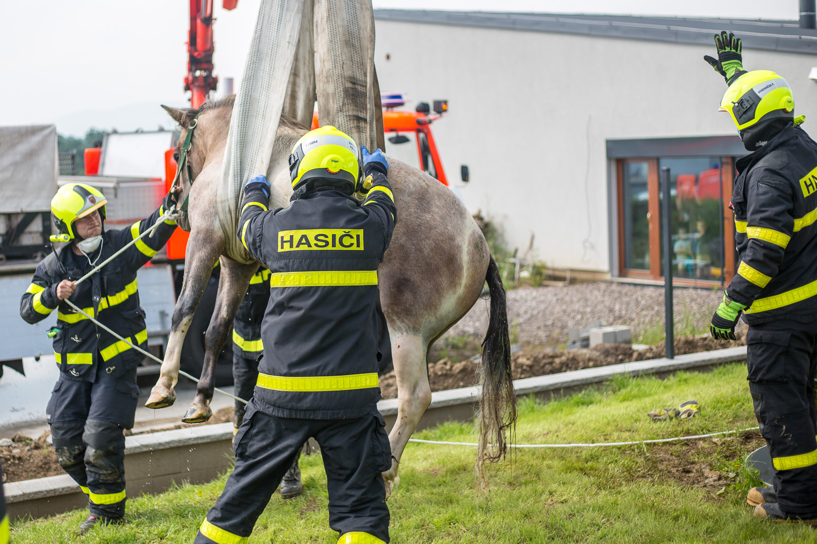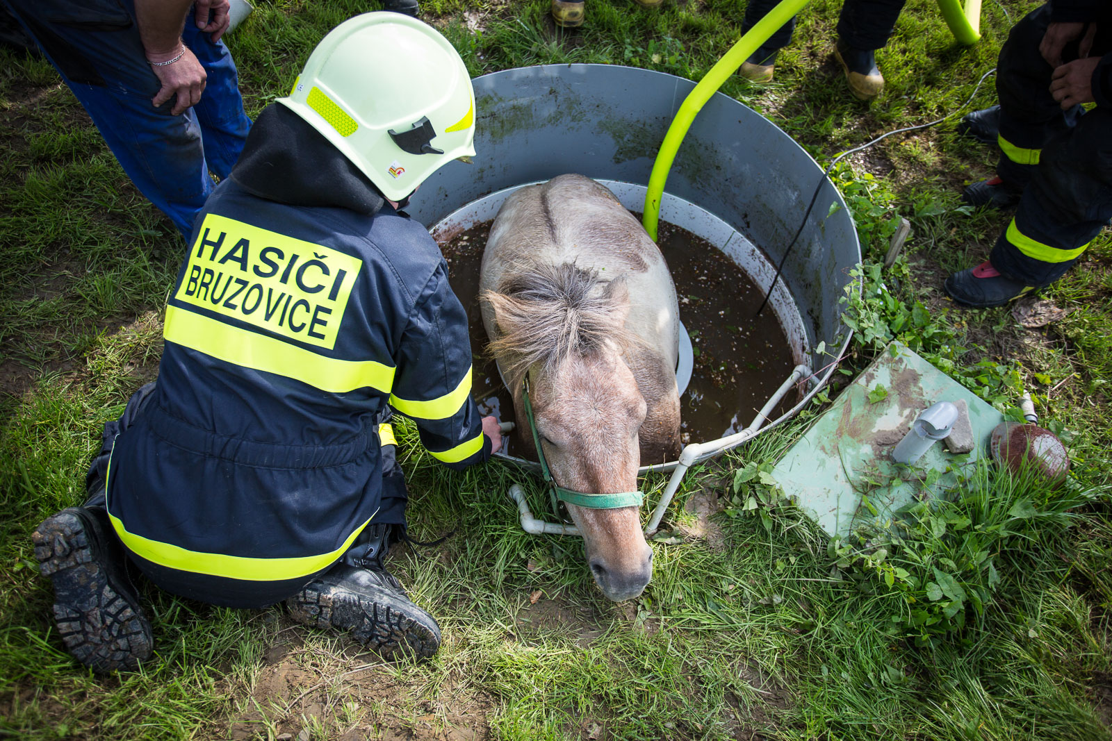 Čtyři jednotky hasičů se v sobotu 25. července 2020 dopoledne postupně zapojily do záchrany asi dvouletého koně, který se v Bruzovicích propadl přes plastový poklop do zhruba dva metry hluboké jímky u rodinného domu.