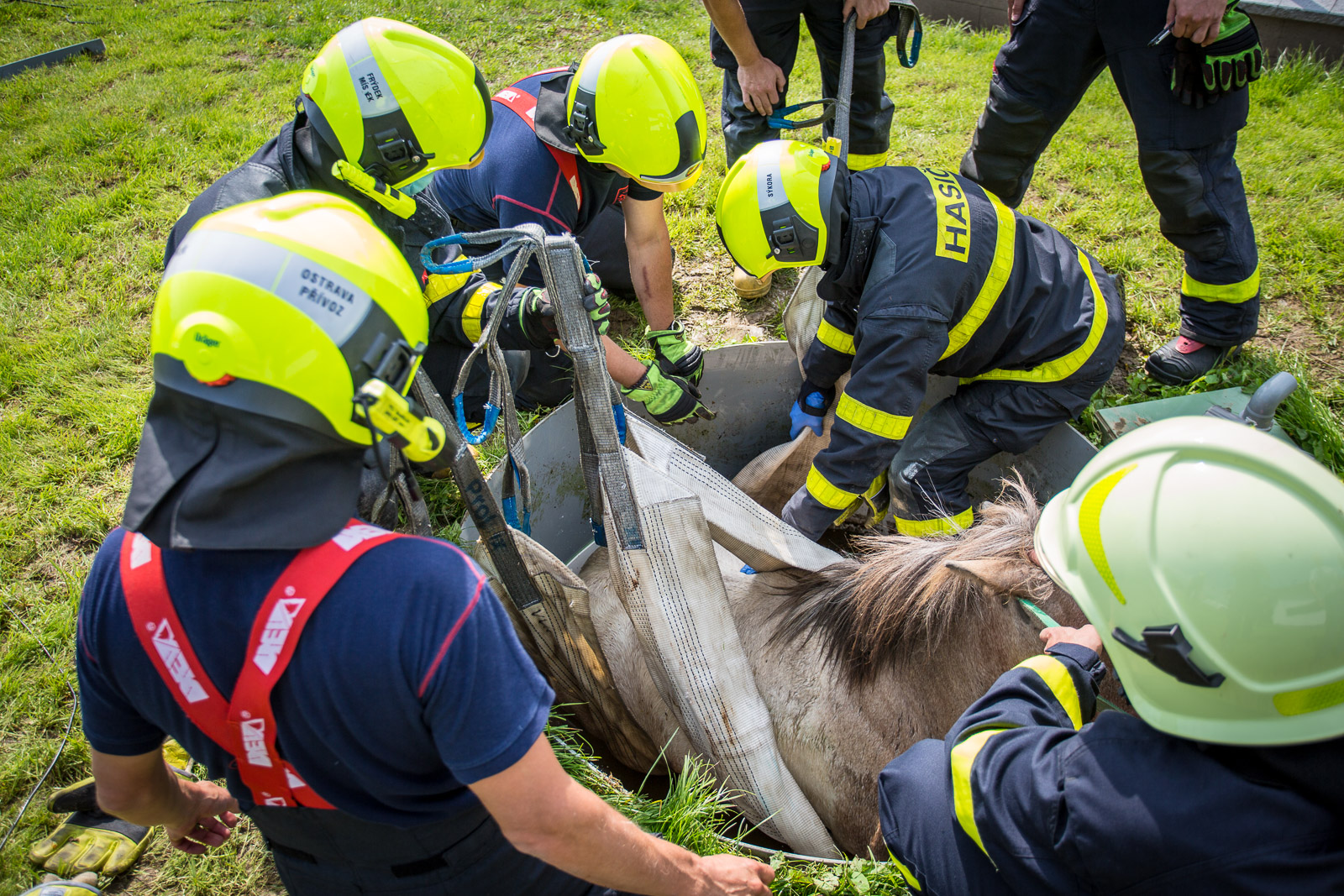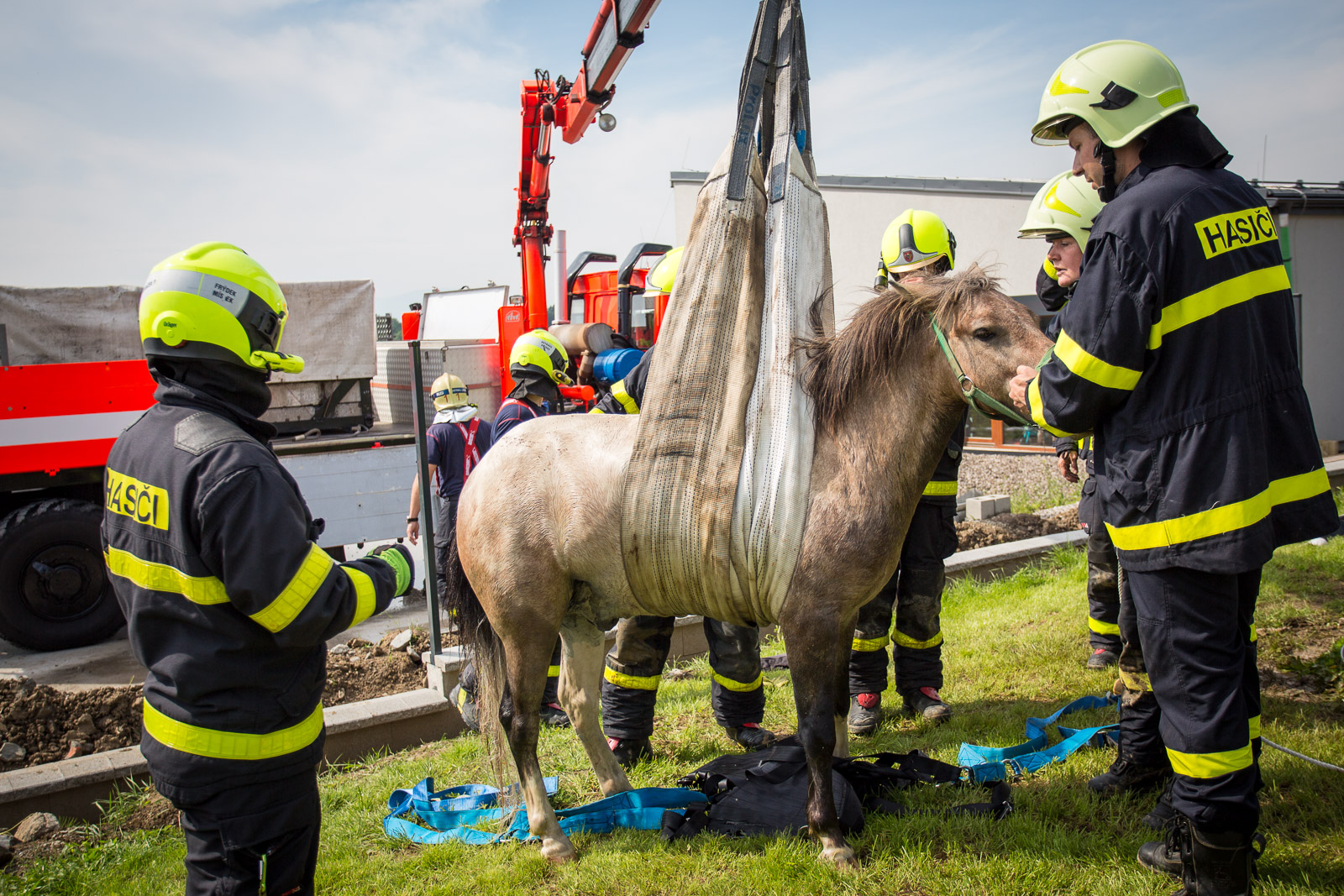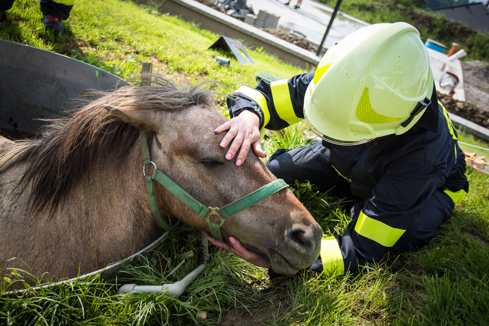 Čtyři jednotky hasičů se v sobotu 25. července 2020 dopoledne postupně zapojily do záchrany asi dvouletého koně, který se v Bruzovicích propadl přes plastový poklop do zhruba dva metry hluboké jímky u rodinného domu.