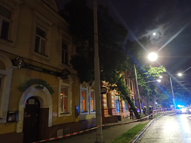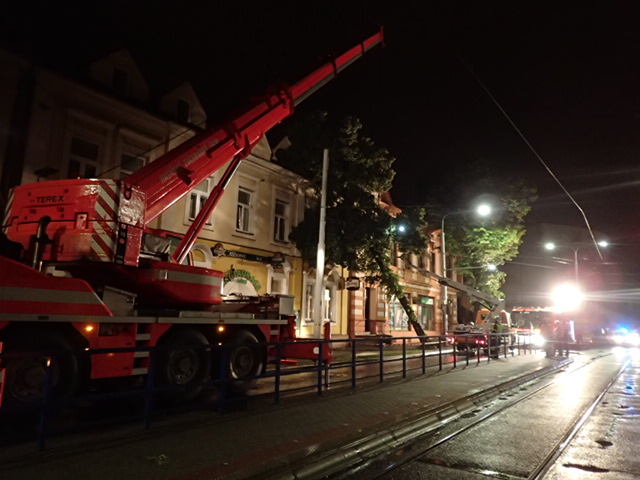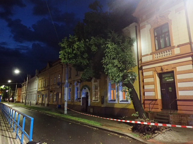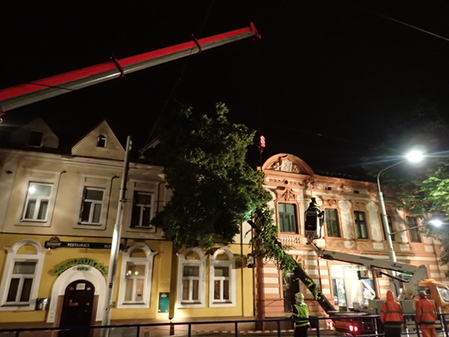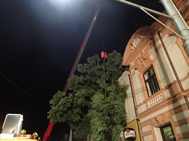 Na snímcích z Nádražní ulice (Moravská Ostrava) hasiči ze tří jednotek HZS MSK (Fifejdy, Přívoz a Zábřeh) odstraňovali v úterý pozdě večer nakloněný strom, opřený o fasádu domu, a to pomocí jeřábu AJ AC60 Demag/Terex (Ostrava-Zábřeh), a také automobilové plošiny AP 42 MB Econic (Přívoz). Lípa měla 25 metrů, průměr kmene 55 cm.