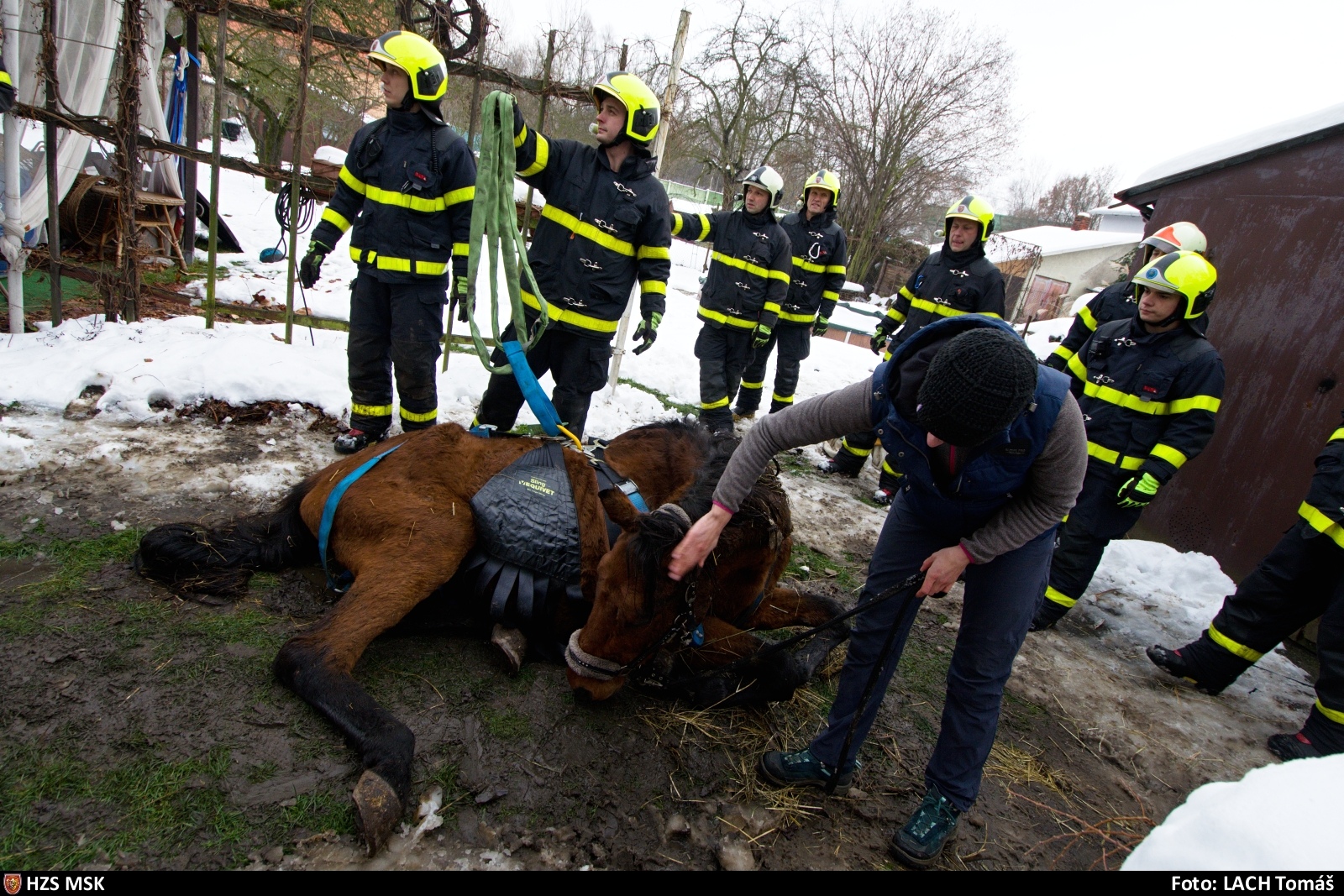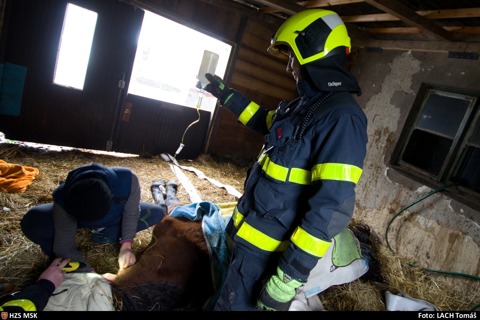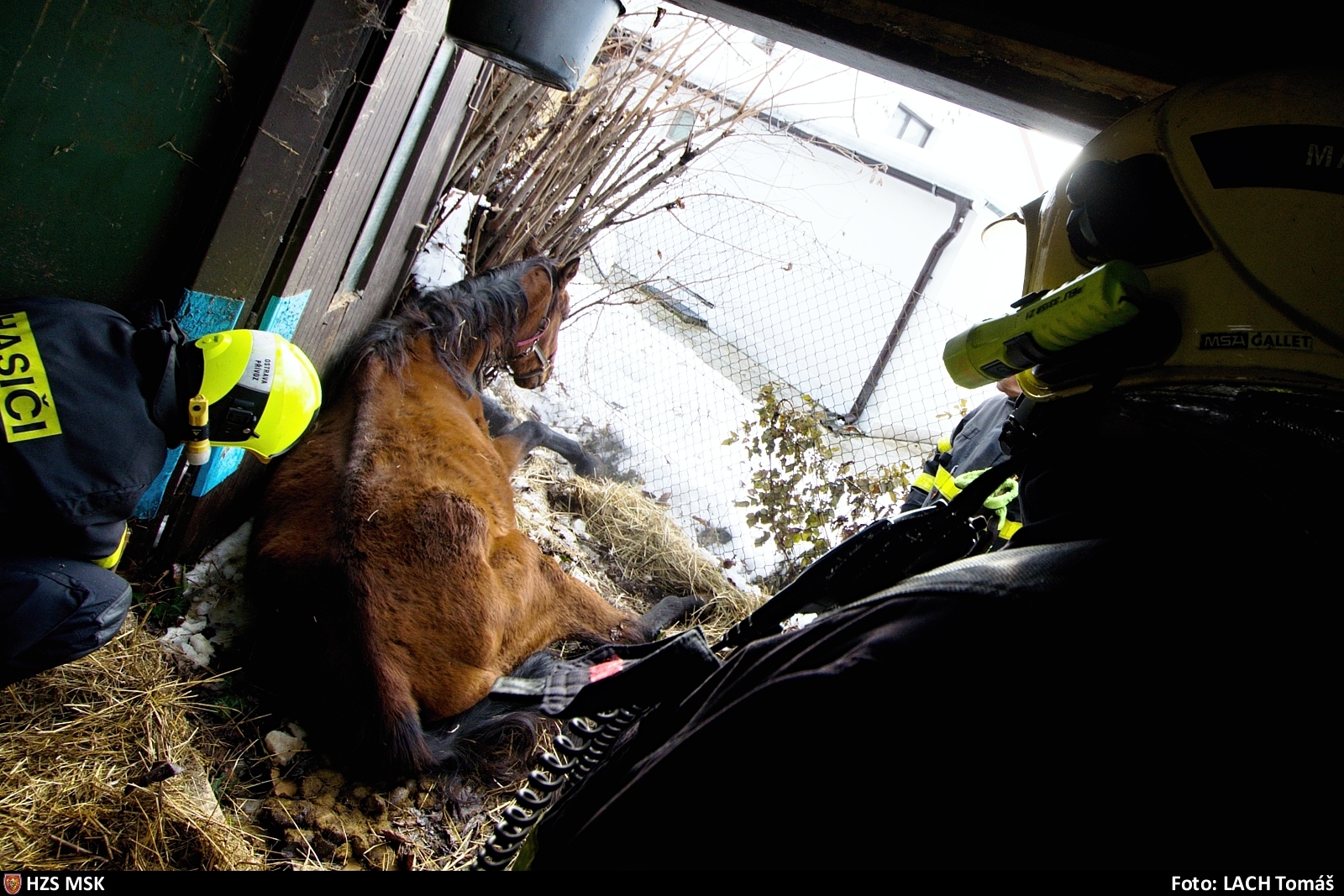 Kůň ležel v úzkém prostoru mezi plotem a stájí. Hasiči rozebrali dřevěný práh a po příjezdu veterinářky koně přesunuli pomocí svých silných paží a hasičských hadic do stáje, kde zvíře dostalo infuzi a lékařskou péči.