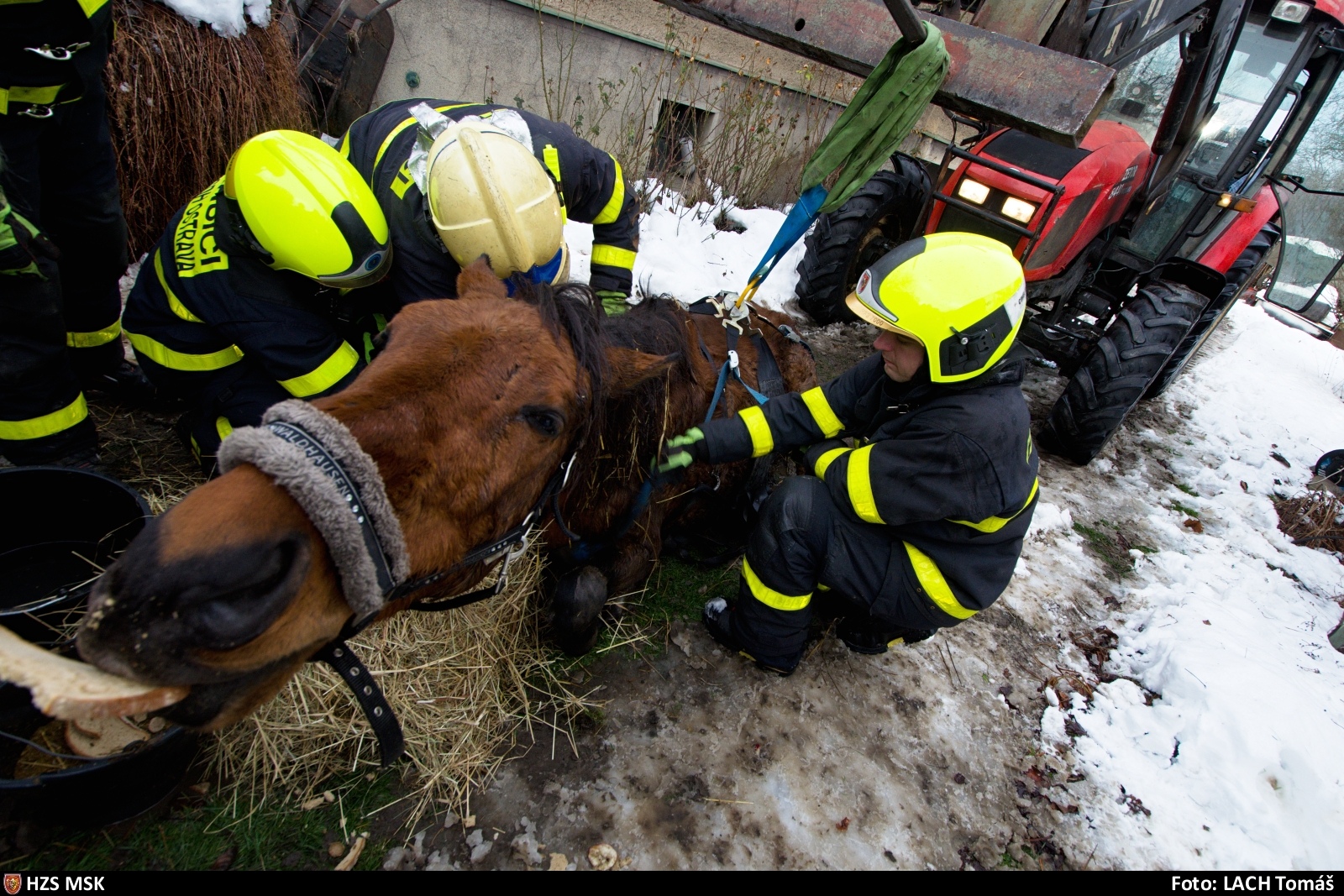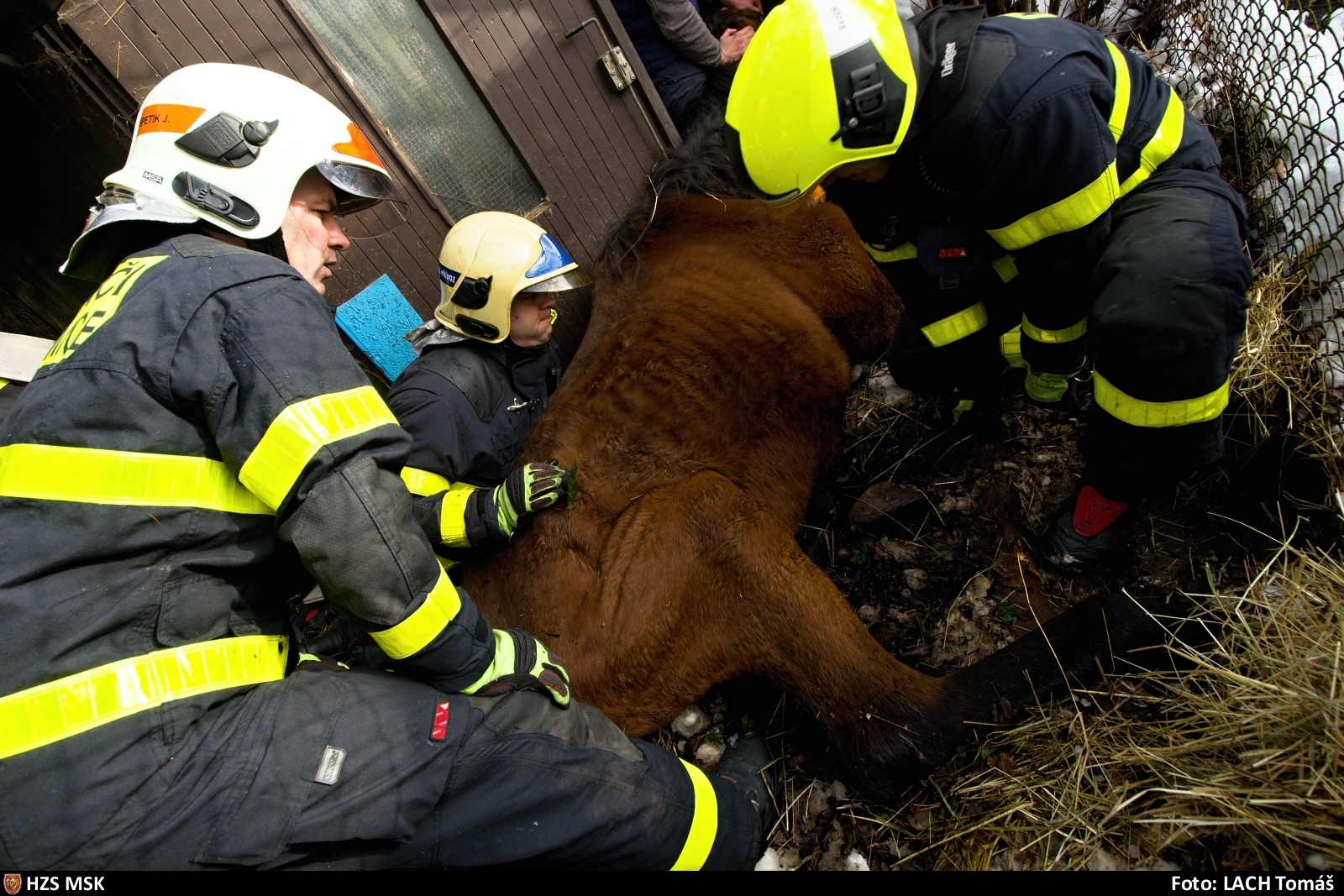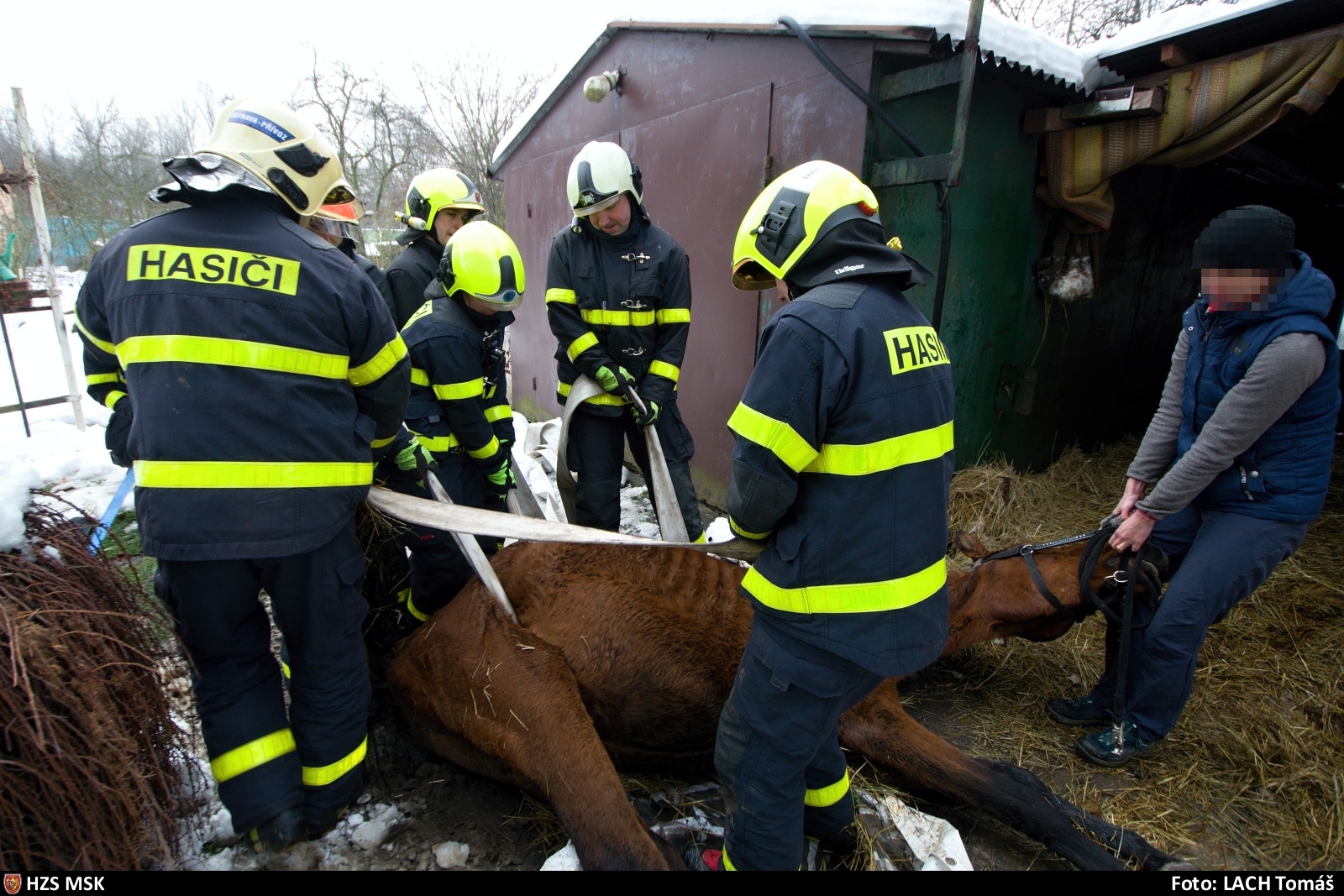 Kůň ležel v úzkém prostoru mezi plotem a stájí. Hasiči rozebrali dřevěný práh a po příjezdu veterinářky koně přesunuli pomocí svých silných paží a hasičských hadic do stáje, kde zvíře dostalo infuzi a lékařskou péči.