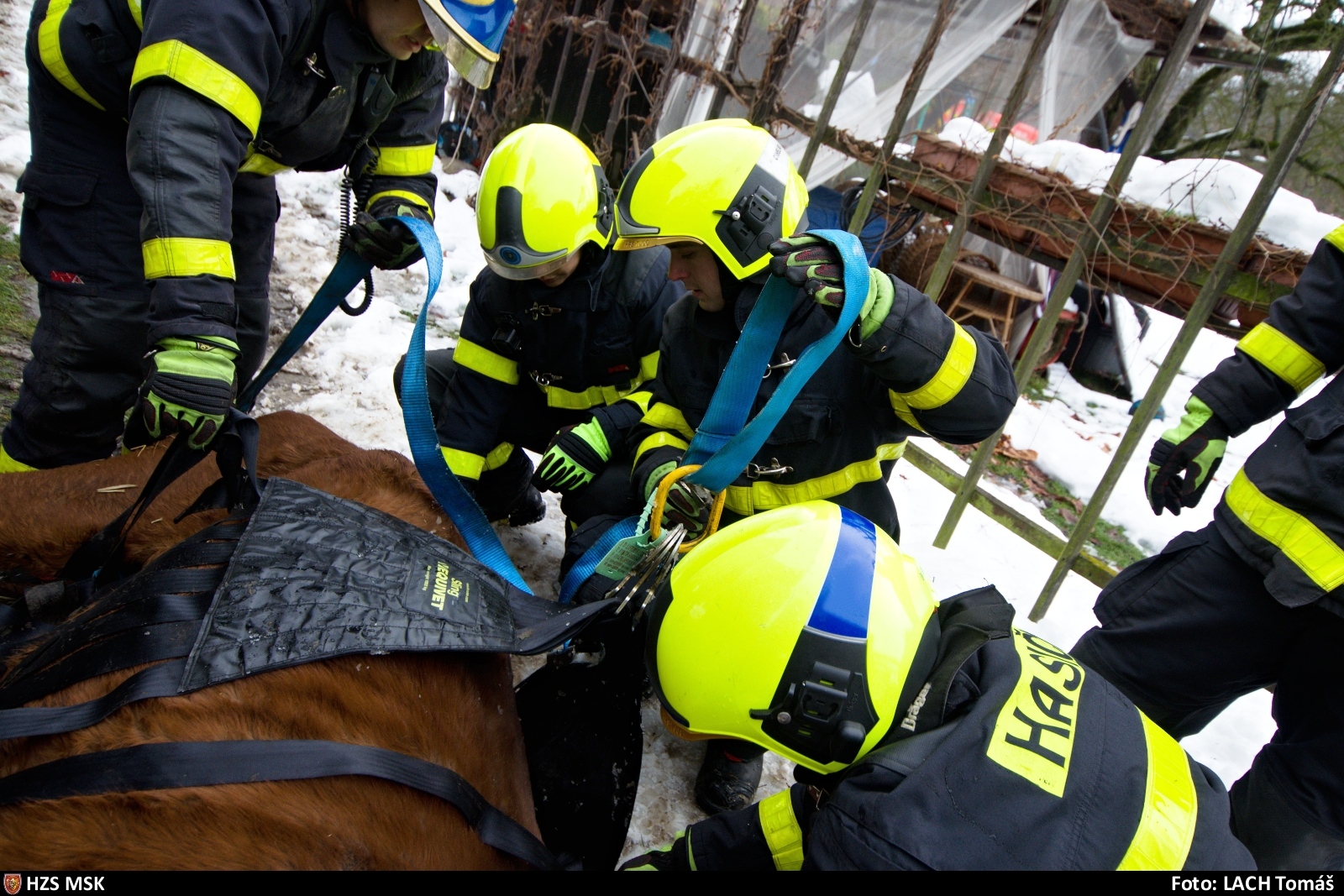 Následně si zasahující jednotky připravily síť pro zvedání zvířat a koně na ni přenesli. Veterinářka pro zvednutí zvířete zajistila traktor, místo nebylo pro techniku hasičů přístupné. Prvotní pokusy o zvednutí koně však nebyly úspěšné.