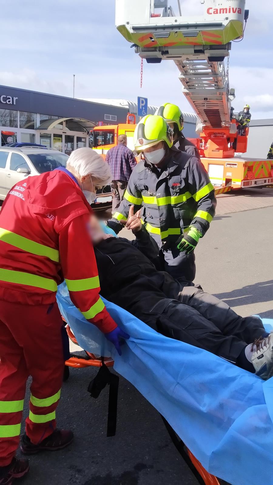 Hasiči opatrně naložili zraněného do koše automobilového žebříku a šetrně jej transportovali na zem, kde si muže převzali do péče zdravotníci.